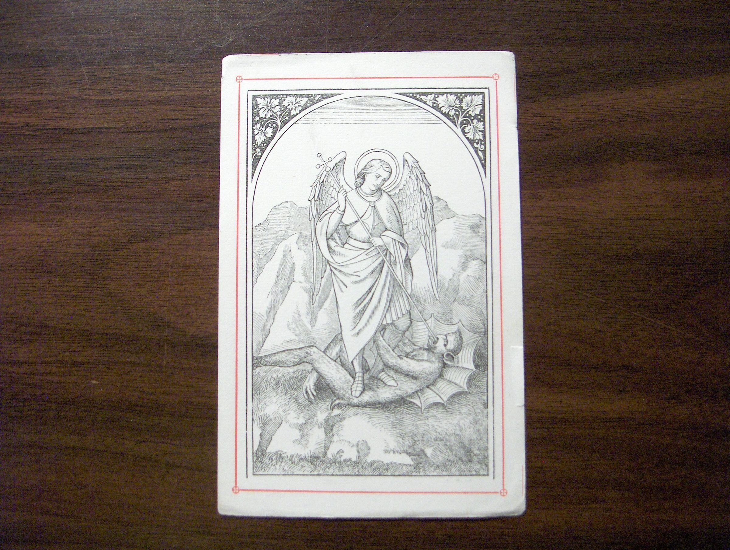 This is a reproduction of a 16th century engraving of Saint Michael the Archangel. He is in the center, on top of the devil and holding a spear which is going through the devil's mouth. This is 1 out of 3 of the same print.