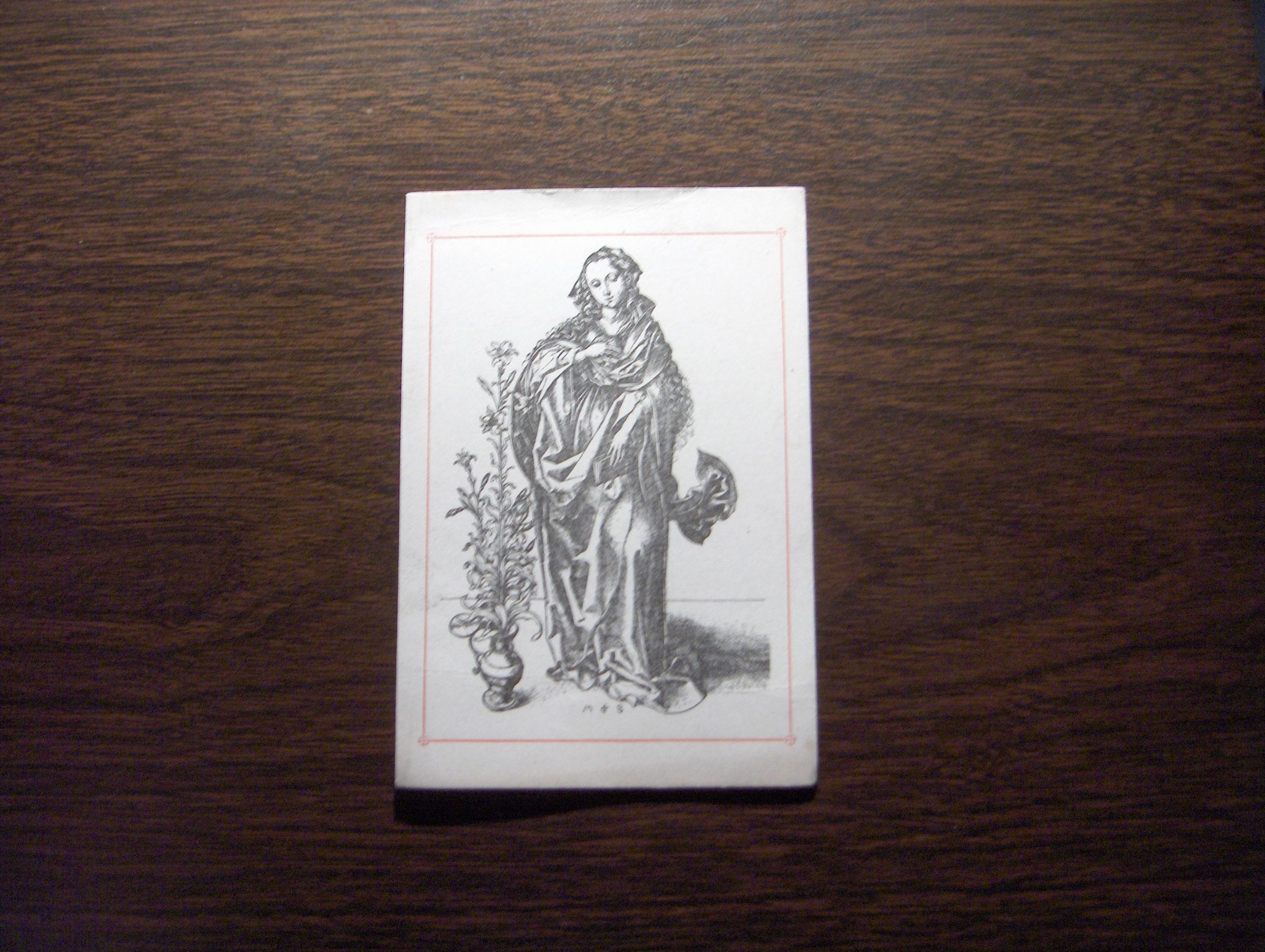 This is a reproduction of a 16th century engraving of Madonna standing holding a book in her left hand and a vase with lilies to her right. This is 1 out of 5 of the same print.