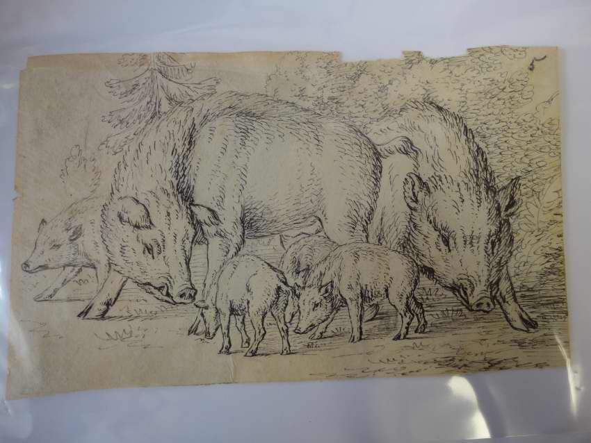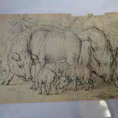 This tiny sketch depicts a family of swine against a landscape backdrop. There appear to be two parents and three small babies.Collection