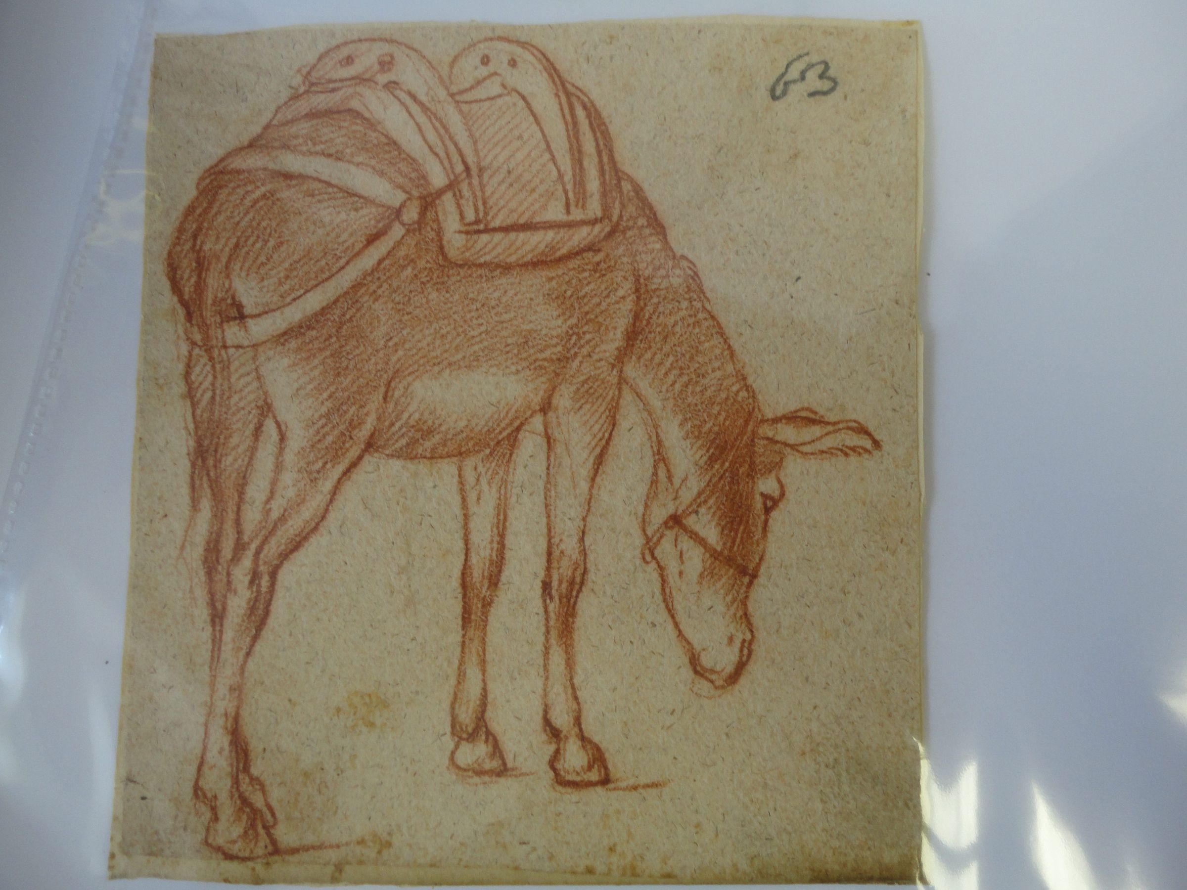 This sketch depicts the back of a mule grazing. The animal is saddled.Collection