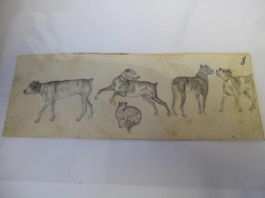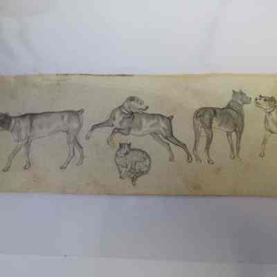 This sketch depicts four dogs playfully running and playing. Also included is a cat who doesn't look very sure of the situation around it.Collection