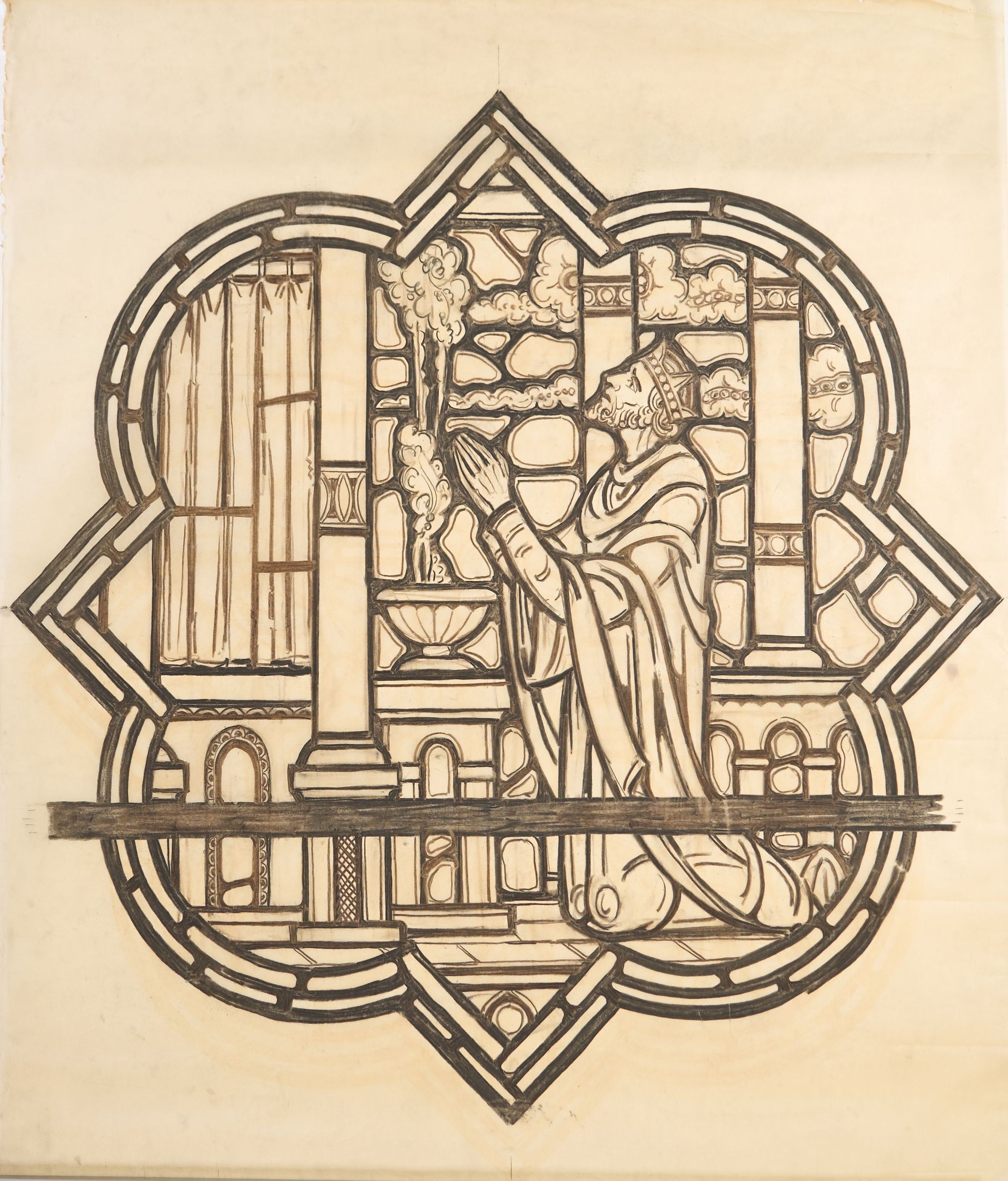 Stained glass scale cartoon, in St., Anselm Church in Swissvale, Pittsburgh, PA. Medallion for an aisle window. Depicts King David repenting at the temple.Type of Drawing
