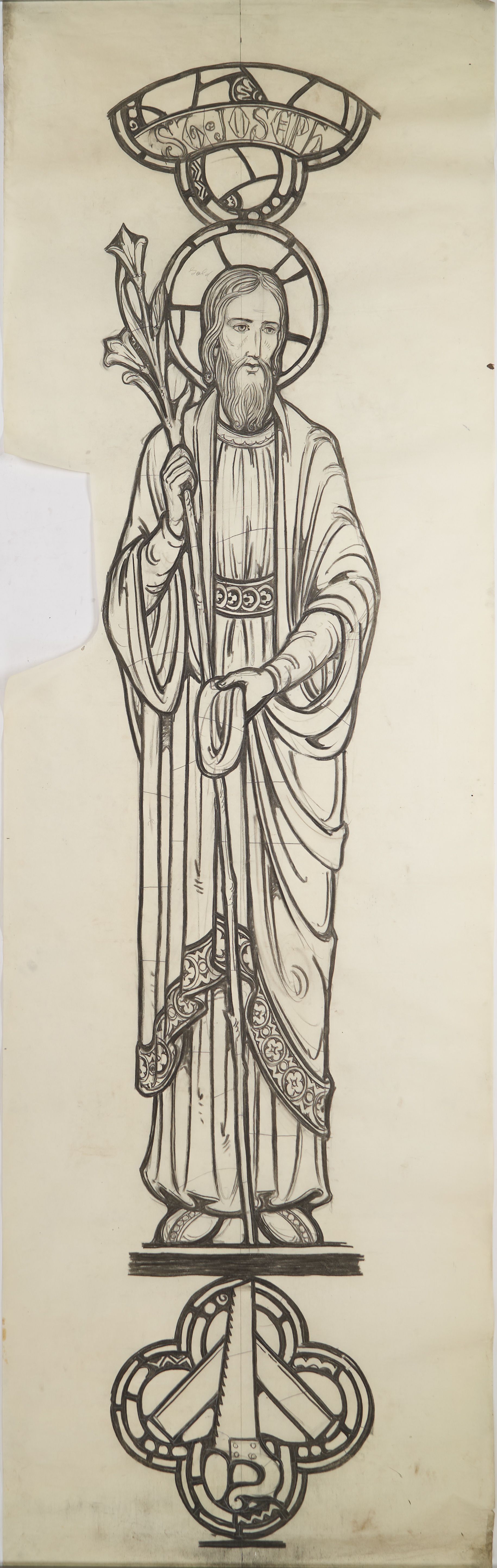 Stained glass scale cartoon, gospel side transept window, St. Anselm's Church, Swissvale, PA.. Depicts St. Joseph holding a lily staff. Under him is a saw and carpenter's square.Type of Drawing