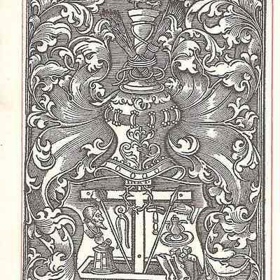 This is a reproduction of a 16th century engraving of symbols of the passion. There is a whip, crown of thorns, cross, crow, and others surrounded by a vine like design. This is 6 out of 6 of the same print.