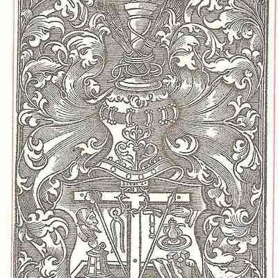 This is a reproduction of a 16th century engraving of symbols of the passion. There is a whip, crown of thorns, cross, crow, and others surrounded by a vine like design. This is 5 out of 6 of the same print.