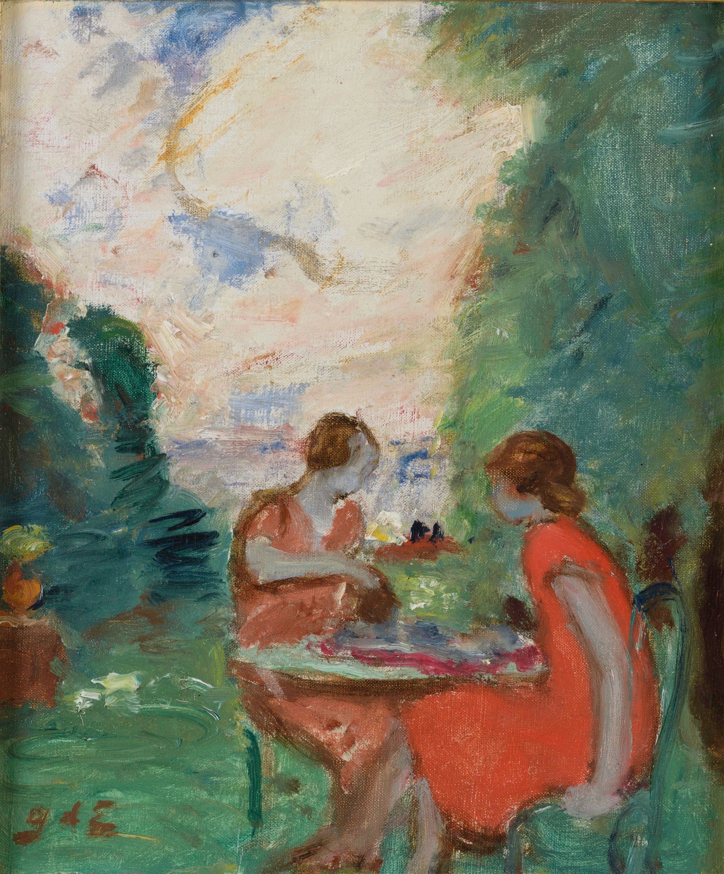 Two seated women dressed in red preparing for tea.Type of Painting