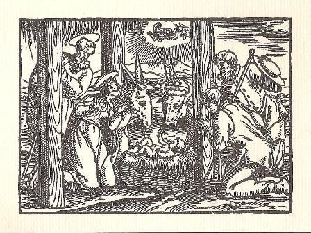Ink, Paper, Print, Ink, Paper, Print, Card, Christmas Card, Nativity, Mary, Joseph, 16th Century, Woodcut, Oxen, Donkey, Shepherds, The Adoration of the Shepherds