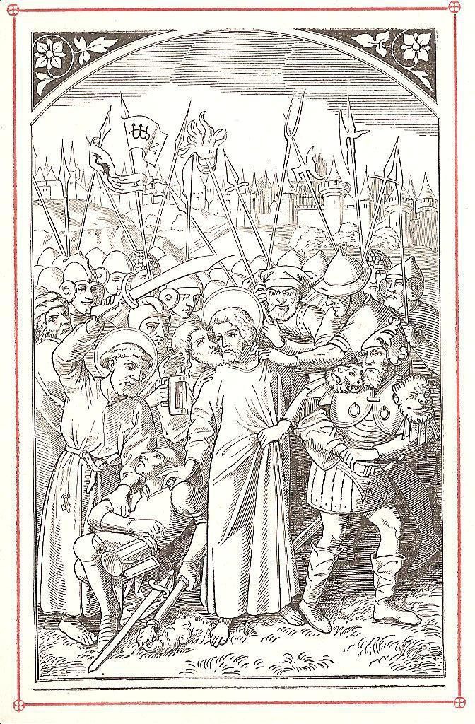 Ink, Paper, Print, Lithograph, Schongauer, Martin, Martin Schongauer, Schongauer, Albrecht Durer, Durer, Albrecht, Durer, Ink, Paper, Print, Lithograph, Prayer Cards, Religious, Religious Subject Matter, Arrest, Jesus, Simon Peter, Judas, Soldiers, Garden of Gethsemane
