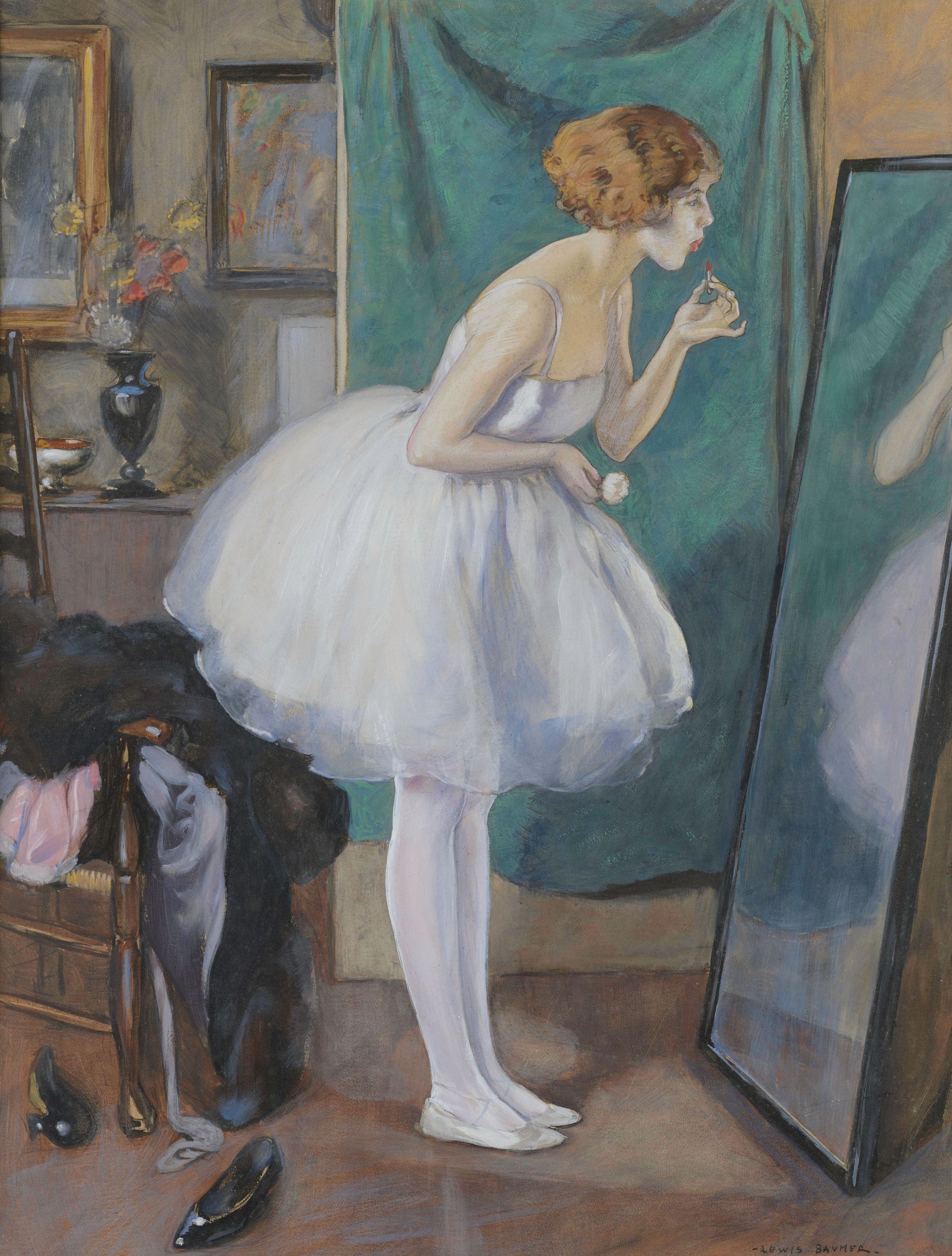The Dancer typifies Baumer’s interest in confident solitary females posed in contemporary settings. Exhibited at the Royal Academy’s Summer Exhibition in 1922, the painting depicts a young ballerina applying lipstick before a full-length mirror. A scattering of clothes is piled on the seat of a wicker chair behind her. His combination of water-based pigments gives the scene a soft, luminous quality. The highly composed vignette points to Baumer’s academic training, while the painting’s illustrative style demonstrates the artist’s commercial understandings.Created By