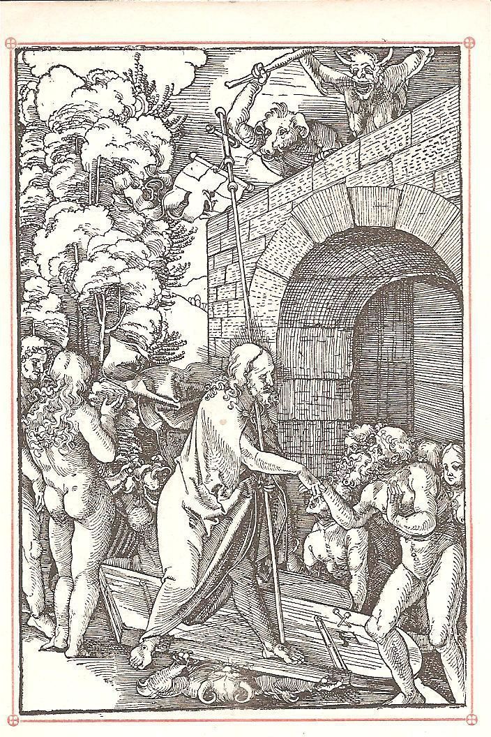 Ink, Paper, Print, Lithograph, Schongauer, Martin, Martin Schongauer, Schongauer, Albrecht Durer, Durer, Albrecht, Durer, Ink, Paper, Print, Lithograph, Prayer Cards, Religious, Religious Subject Matter, Jesus, Descended, Hell, Harrowing, Demons, Adam, Eve, Souls, Resurrection, Death