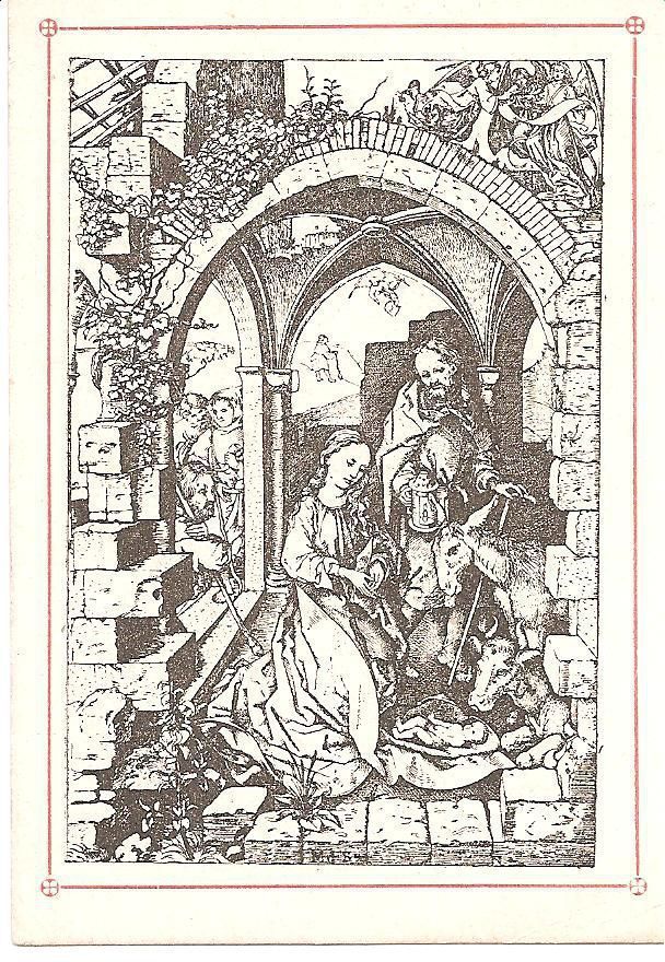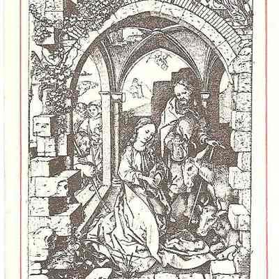This is a reproduction of a 16th century engraving of the Nativity. Baby Jesus is on the ground surrounded by Mary, Joseph, and animals all a stone archway. There are people looking in the archway and angels on top of the arch way. This is 3 out of 5 of the same print.