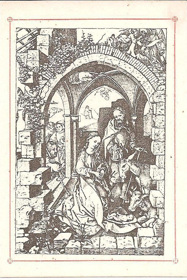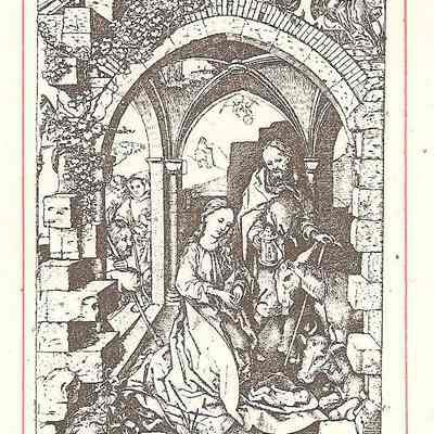 This is a reproduction of a 16th century engraving of the Nativity. Baby Jesus is on the ground surrounded by Mary, Joseph, and animals all a stone archway. There are people looking in the archway and angels on top of the arch way. This is 5 out of 5 of the same print.