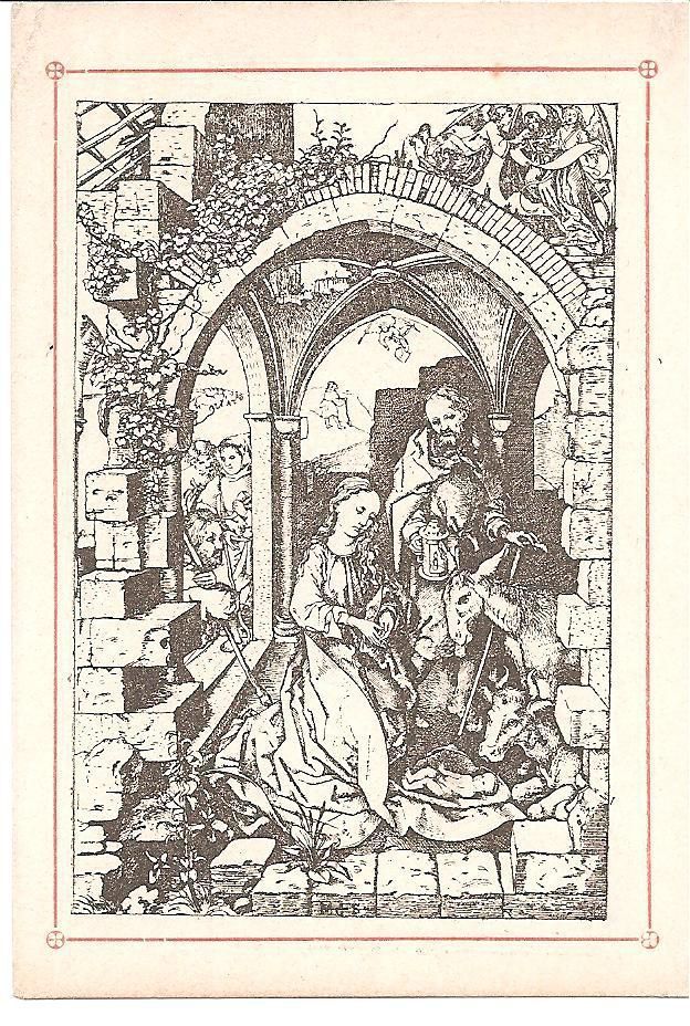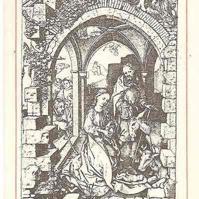 This is a reproduction of a 16th century engraving of the Nativity. Baby Jesus is on the ground surrounded by Mary, Joseph, and animals all a stone archway. There are people looking in the archway and angels on top of the arch way. This is 2 out of 5 of the same print.