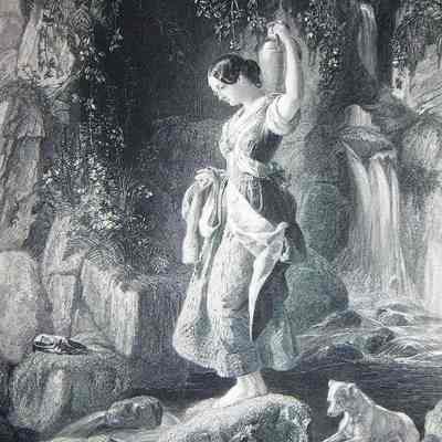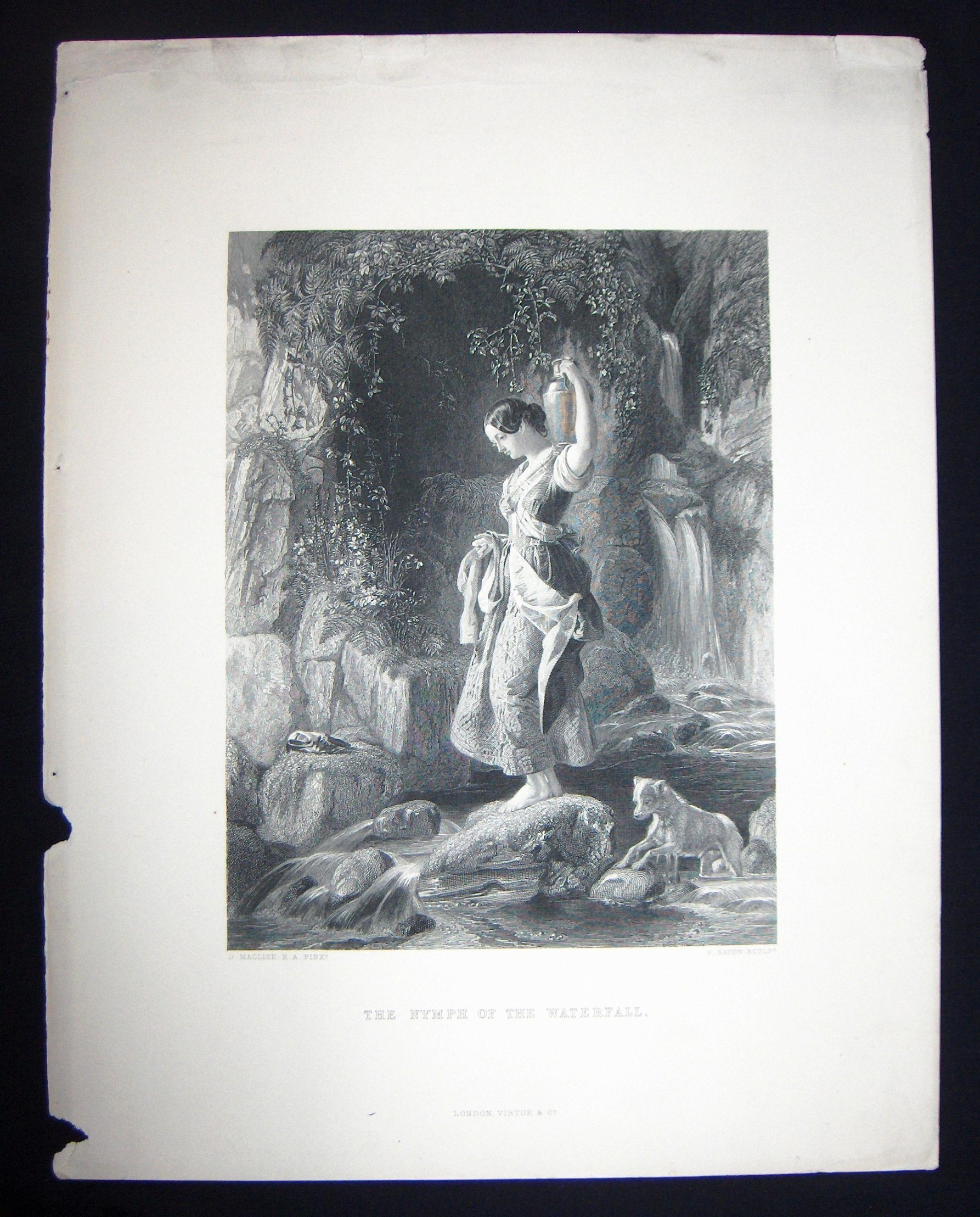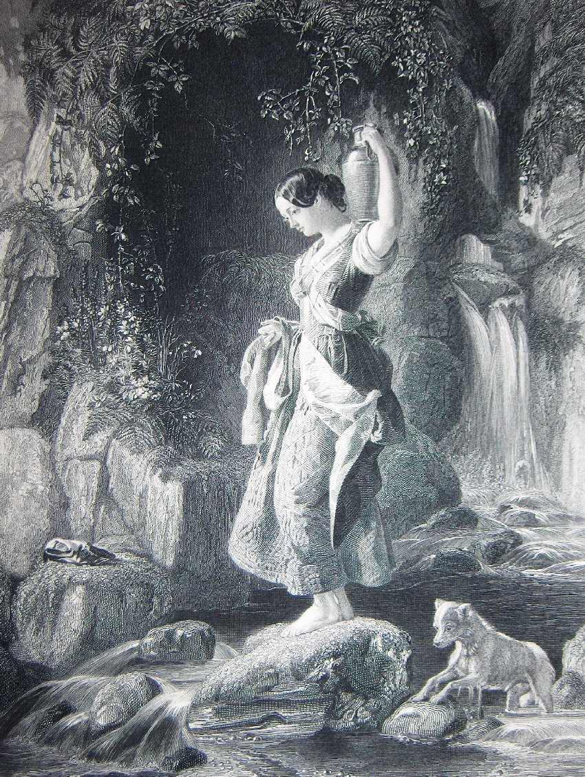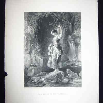 Ink, Paper, Print, Lithograph, Ink, Paper, Print, Lithograph, Maclise, D., D. Maclise, Bacon, F., F. Bacon, Nymph, Baby Wolf, Waterfall, Woman, Stones, Forest