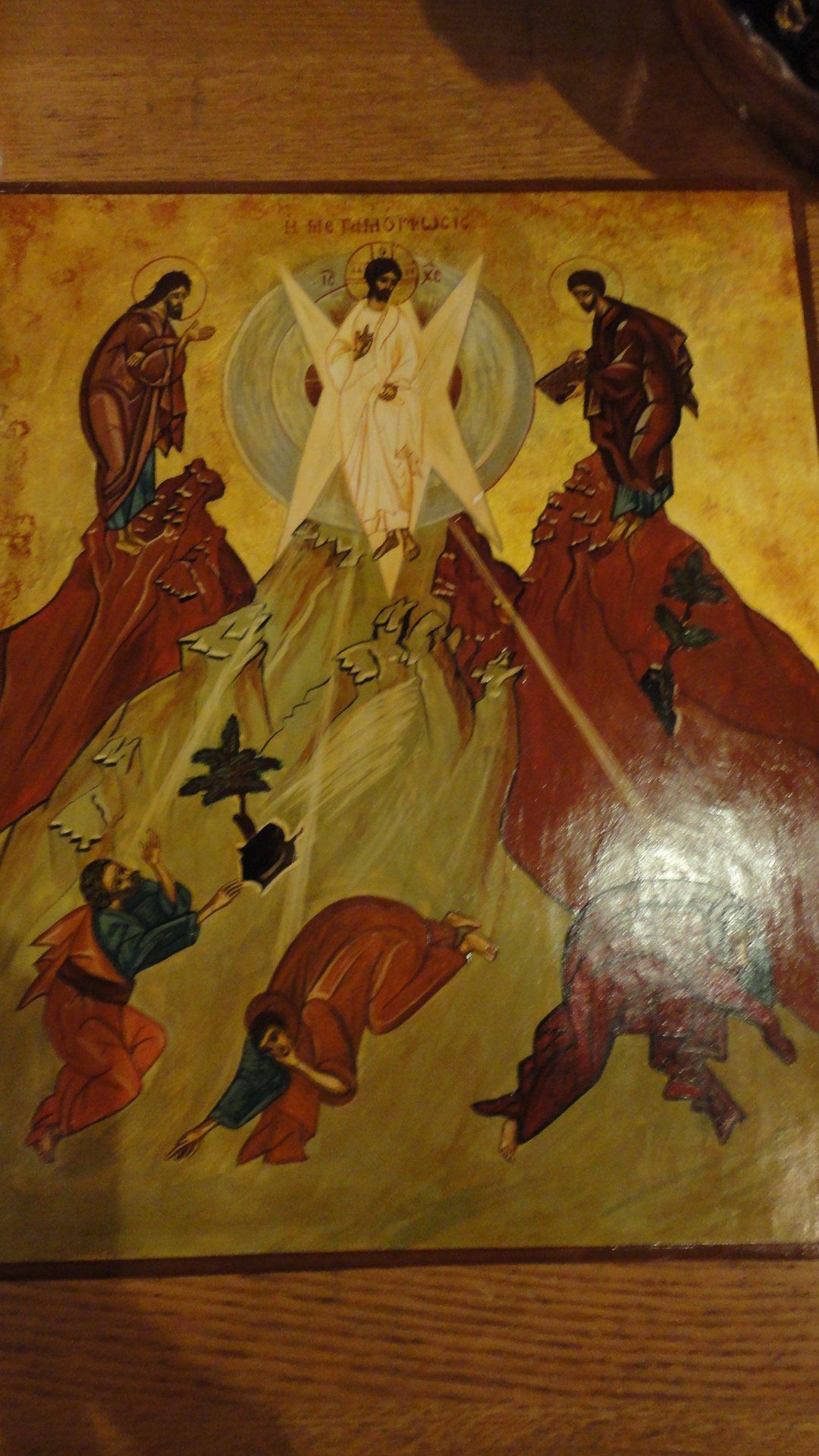 Christ stands on the mountain, surrounded by prophets while his Apostles cower on the ground below.Collection