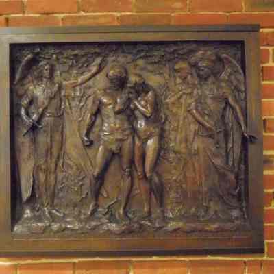 Relief sculpture of Adam and Eve being banished from the garden of Eden by two angels with swords. Inscription below there feet reads "Therfore the Lord God sent them forth from the garden." Due to lack of information, the accession number indicates the date of inventory not the date of acquesition.Artwork Details