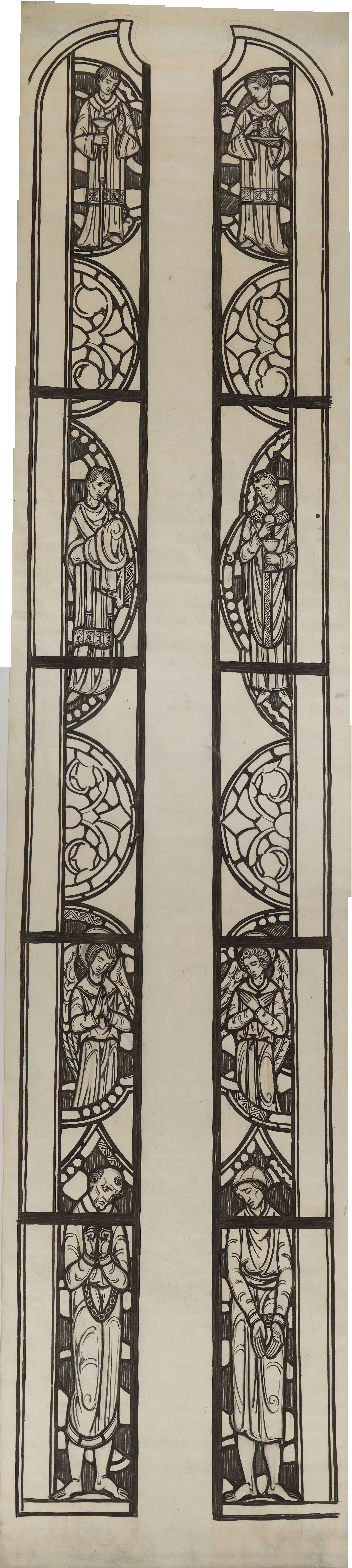 Stained glass scale cartoon, additions to the main light of Religious Orders clerestory window at Rosary Cathedral in Toledo, OH. Depictions on the left: an altar server with candle, a deacon carrying veiled chalice, angel, a man in shackles. Depictions on the right: an altar server with two cruets, a priest with the holy Eucharist, an angel, a man in shackles.Type of Drawing