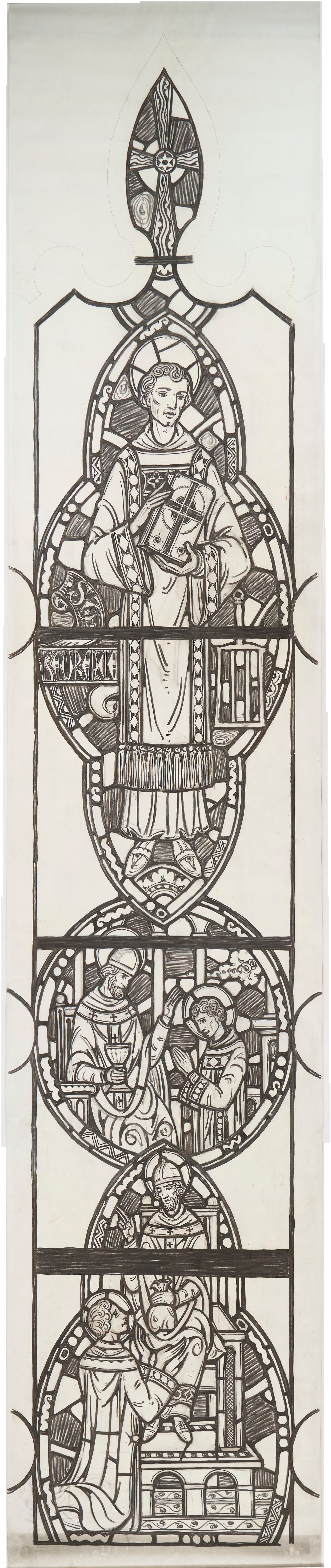 Stained glass scale cartoon, light of aisle window in Our Lady, Queen of the Most Holy Rosary Cathedral in Toledo, Ohio. Depictions from top to bottom: St. Lawrence holding a Bible, next to a gridiron, on which he was said to have been burnt; two scenes of St. Lawrence with a bishop.Type of Drawing