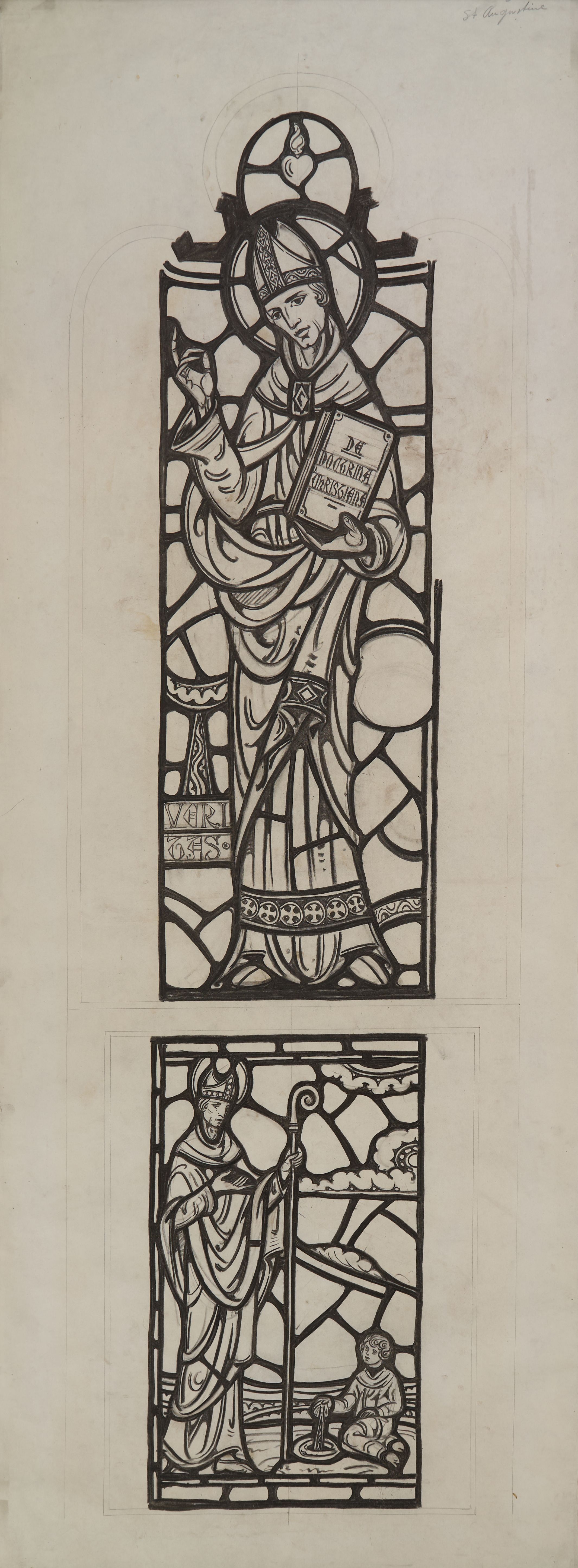 Stained glass scale cartoon, aisle window at Rosary Cathedral in Toledo, OH. Depicts St. Augustine of Hippo with his book "De Doctrina Christiana" (On Christian Doctrine). Below Augustine is depicted with a child playing in the water.Type of Drawing