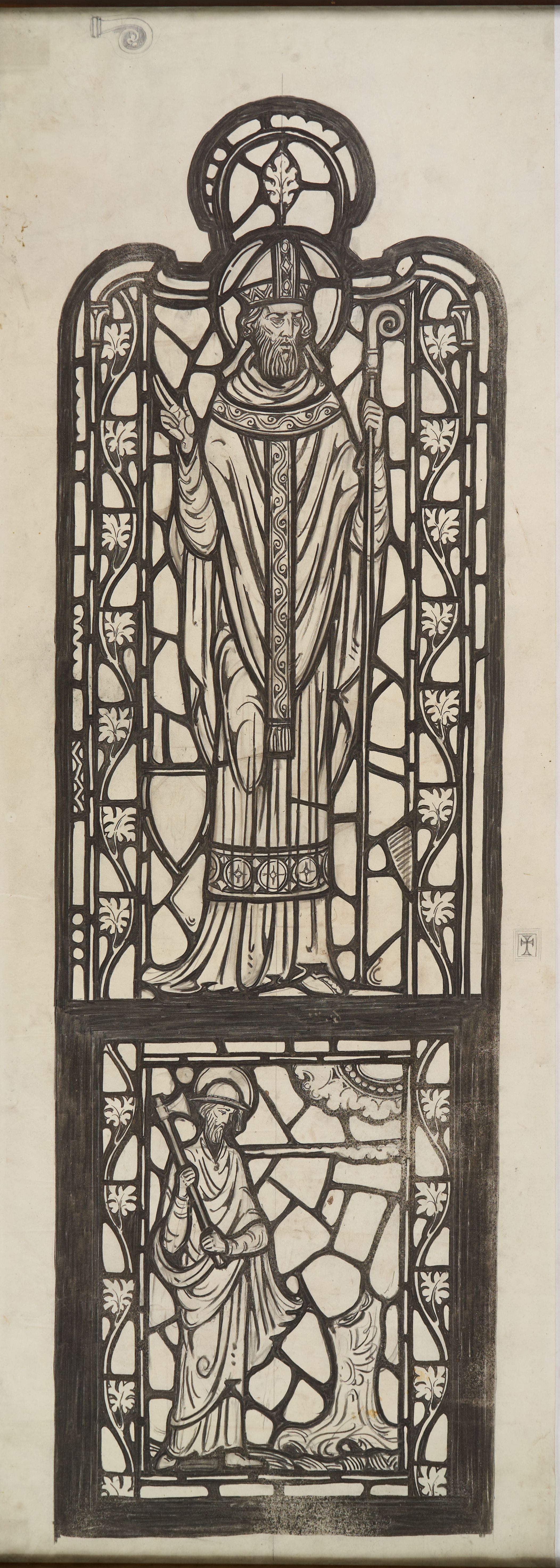 Stained glass scale cartoon, aisle window at Rosary Cathedral in Toledo, OH. Depicts St. Boniface with a bishop's crozier; St. Boniface chopping down Donar's Oak, the wood of which was used by Boniface for a church to St. Peter.Type of Drawing