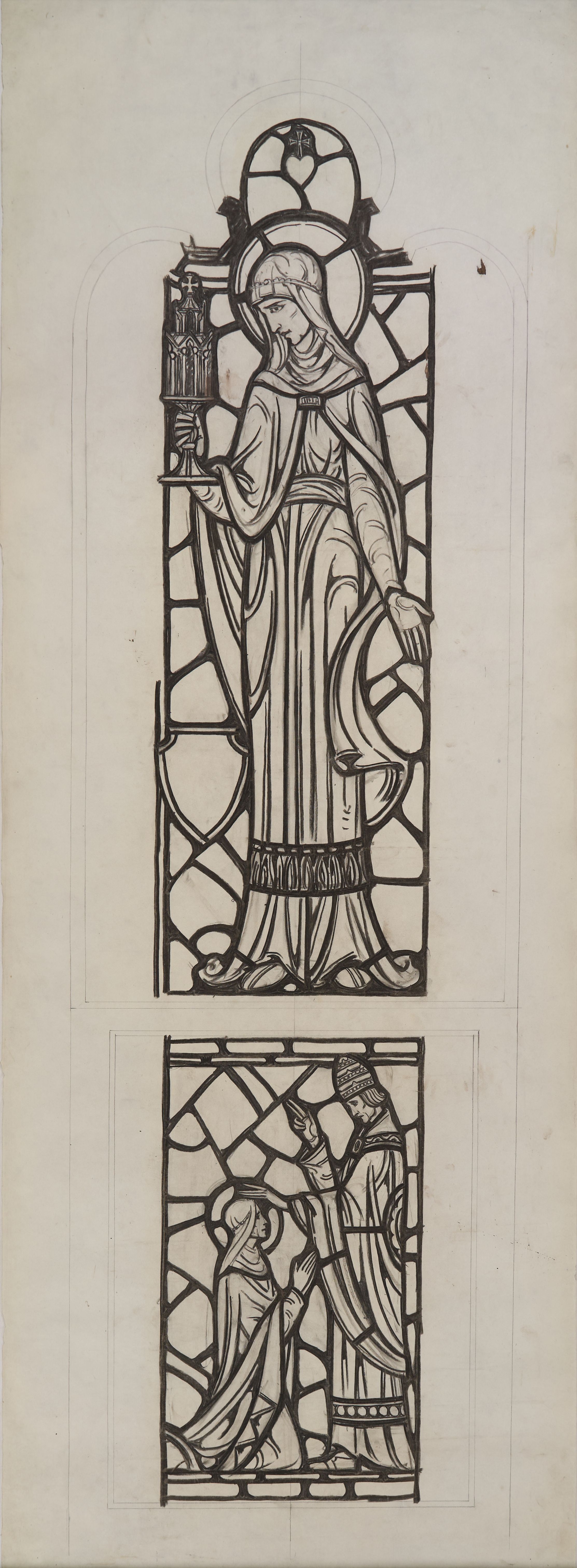 Stained glass scale cartoon, aisle window at Rosary Cathedral in Toledo, OH. Depicts St. Bridget of Sweden holding a religious vessel; below St. Bridget during an audience with Pope Urban V.Type of Drawing