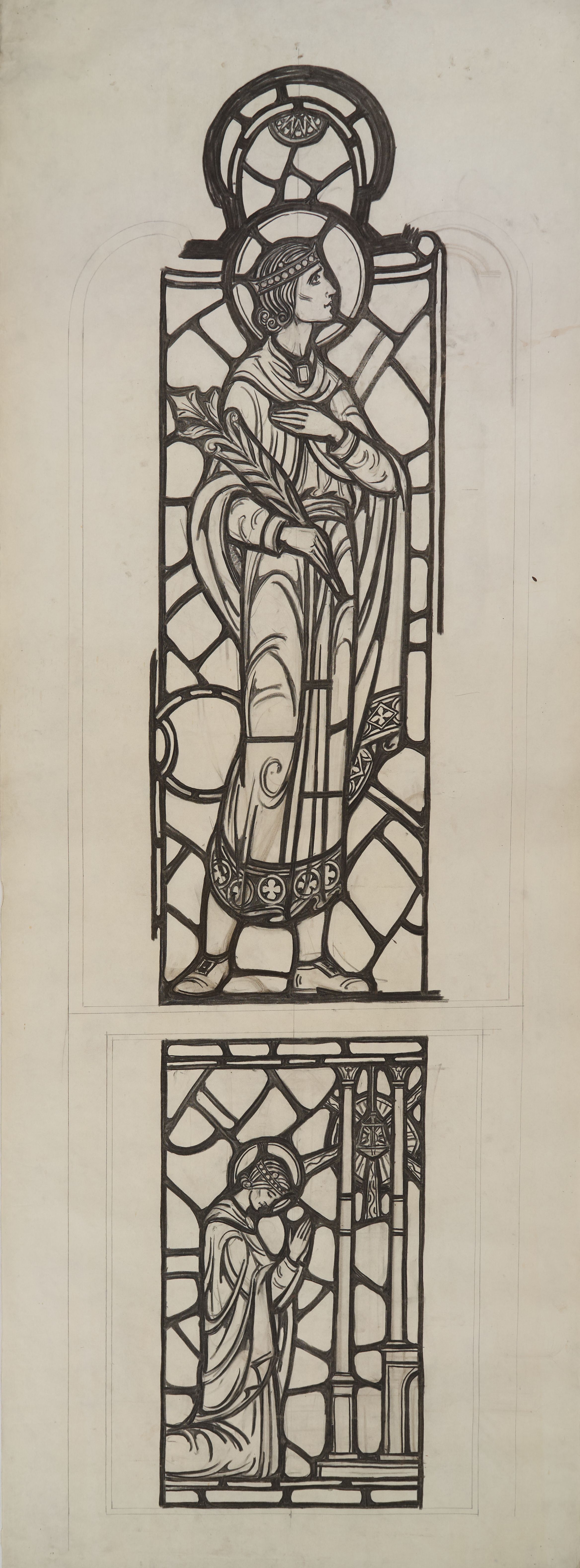 Stained glass scale cartoon, aisle window at Rosary Cathedral in Toledo, OH. Depicts St. Casimir holding a lily; below St. Casimir praying before a sanctuary lamp.Type of Drawing