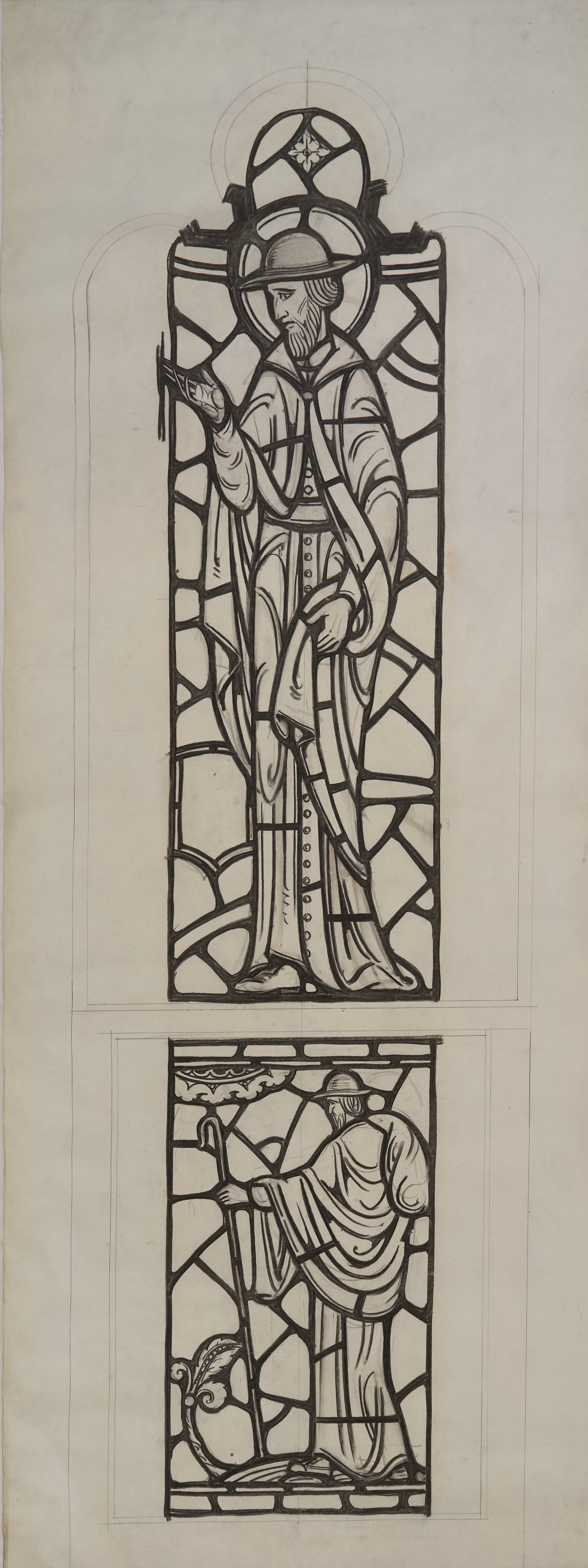 Stained glass scale cartoon, aisle window at Rosary Cathedral in Toledo, OH. Depicts St. Clement Hofbauer; below St. Clement Hofbauer journeying to Rome.Type of Drawing