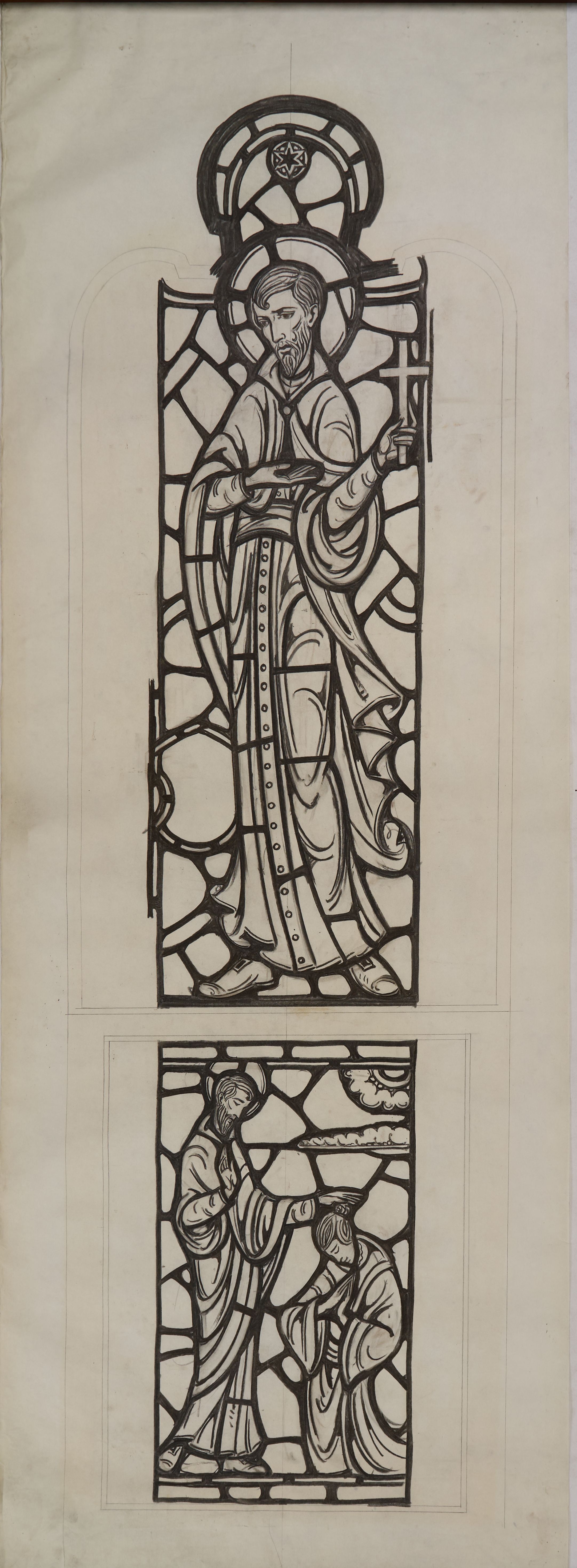 Stained glass scale cartoon, aisle window at Rosary Cathedral in Toledo, OH. Depicts St. Francis Xavier with a cross; below St. Francis Xavier blesses a Japanese man.Type of Drawing
