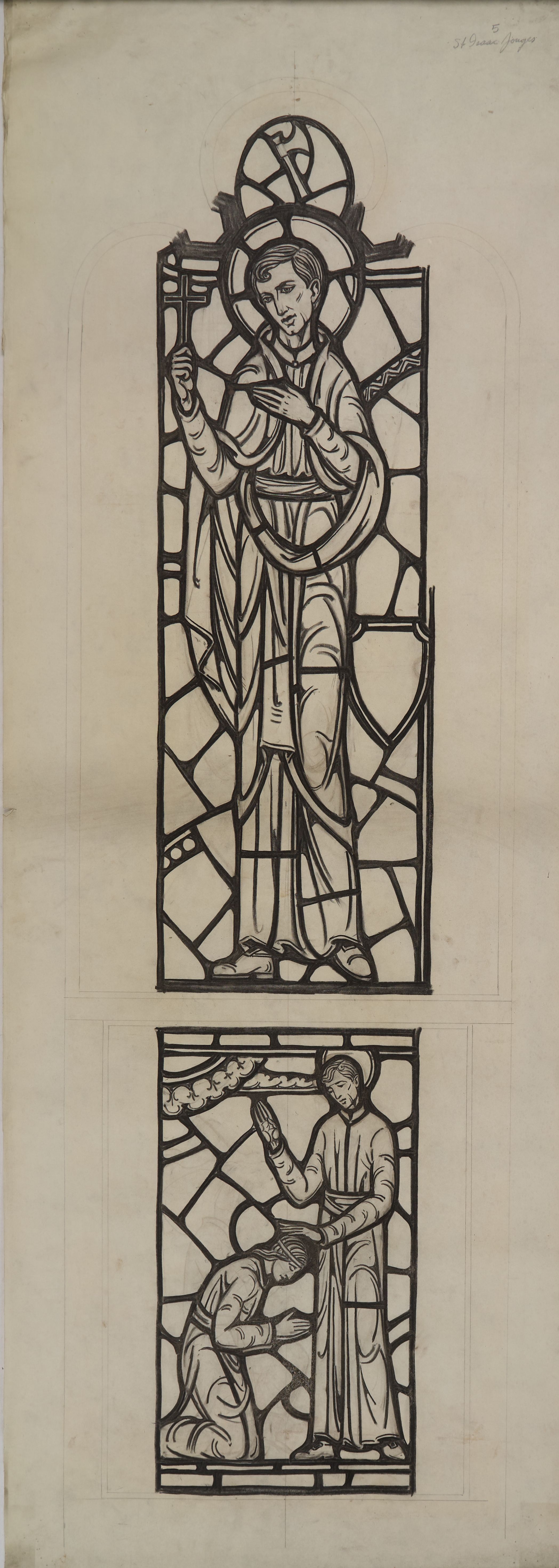Stained glass scale cartoon, aisle window at Rosary Cathedral in Toledo, OH. Depicts St. Isaac Jogues with a cross; below St. Isaac Jogues blesses an American Indian.Type of Drawing