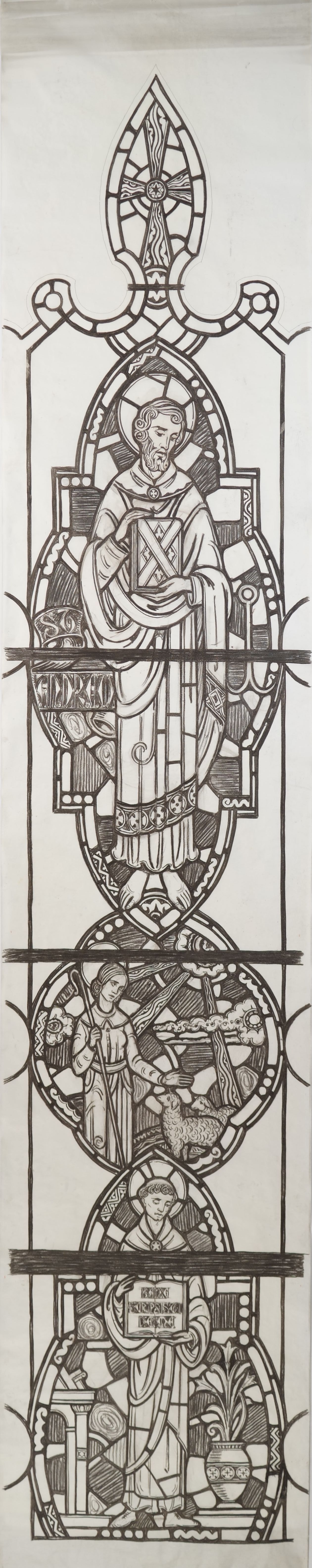 Stained glass scale cartoon, left light of All Saints aisle window in Our Lady, Queen of the Most Holy Rosary Cathedral in Toledo, Ohio. Depictions from top to bottom: St. Andrew holding a book (the "X" shape alludes to his crucifixion on an x-shaped cross) with an anchor next to him; St. Germaine Cousin with sheep; St. Thomas Aquinas with a book reading "Bene Scripsisti De Me" ("You have written well about me[, Thomas]").Type of Drawing