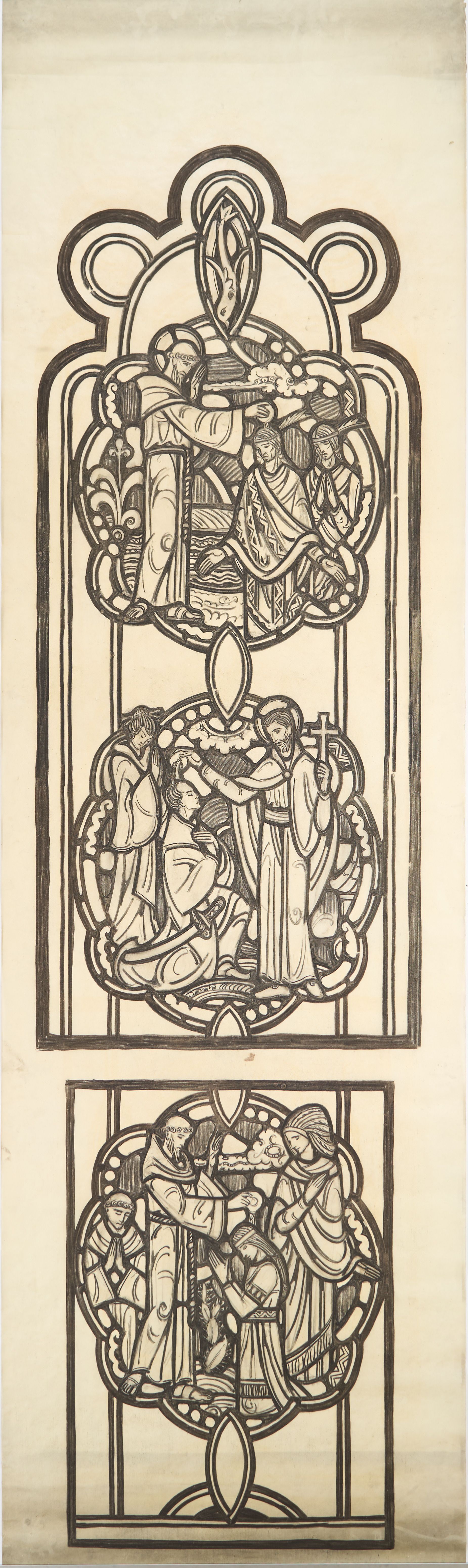 Stained glass scale cartoon; right light of east window of Blessed Sacrament Chapel (formerly a baptistry) at Rosary Cathedral, Toledo, OH. Depictions from top to bottom: a fish; a monk baptizing American Indians on the shore; St. Francis Xavier baptizing two Japanese individuals; the baptism of St. Kateri Tekakwitha by Pere Jacques de Lamberville.Type of Drawing