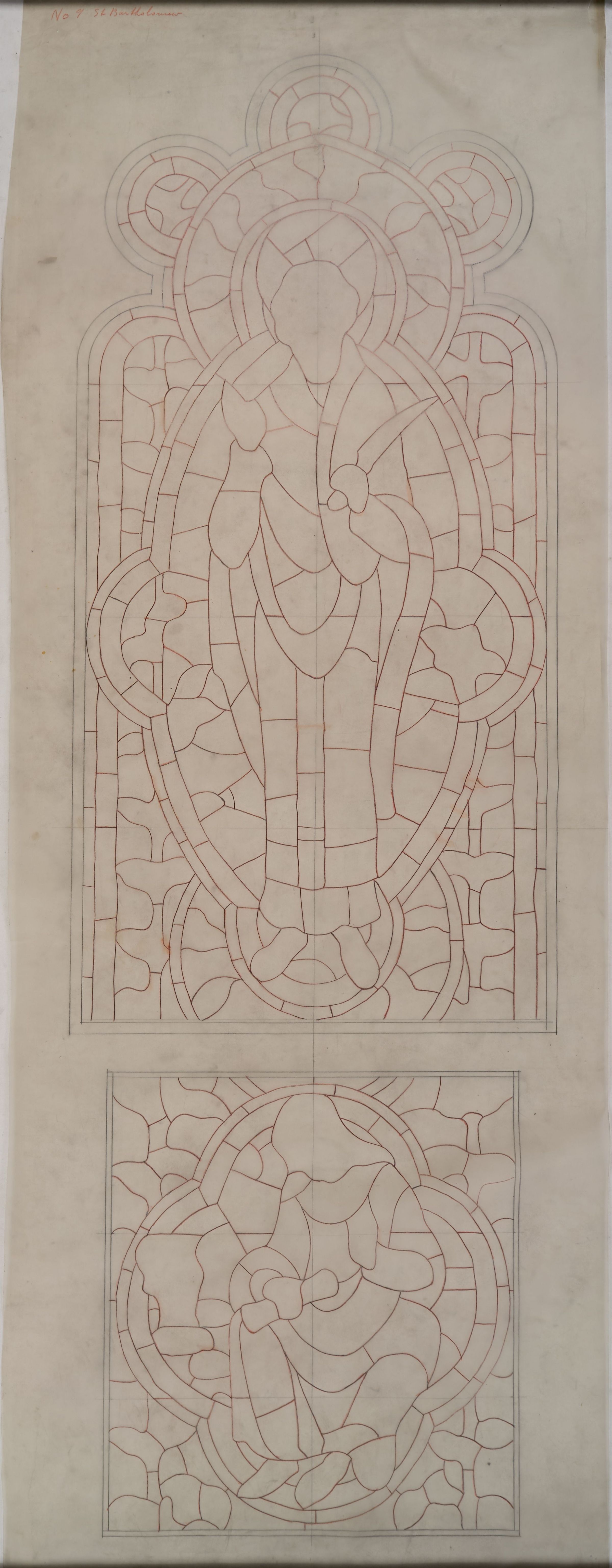 Stained glass scale cartoon, Bishop's Chapel Window at Rosary Cathedral in Toledo, OH. Depicts St. Bartholomew with a knife; the prophet Obadiah with a scroll and urn.Type of Drawing