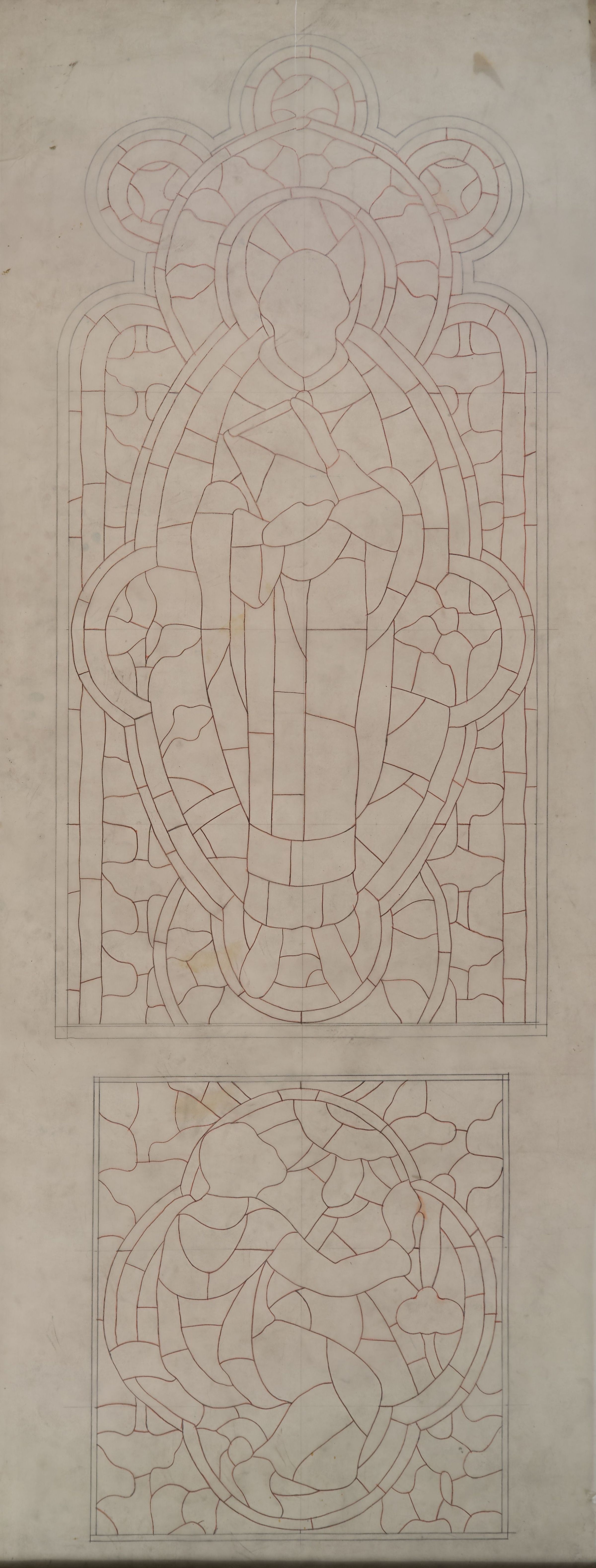 Stained glass scale cartoon, Bishop's Chapel Window at Rosary Cathedral in Toledo, OH. Depicts St. Matthew with a Bible; the prophet Nahum seeing an angel emerge from clouds. OutlineType of Drawing