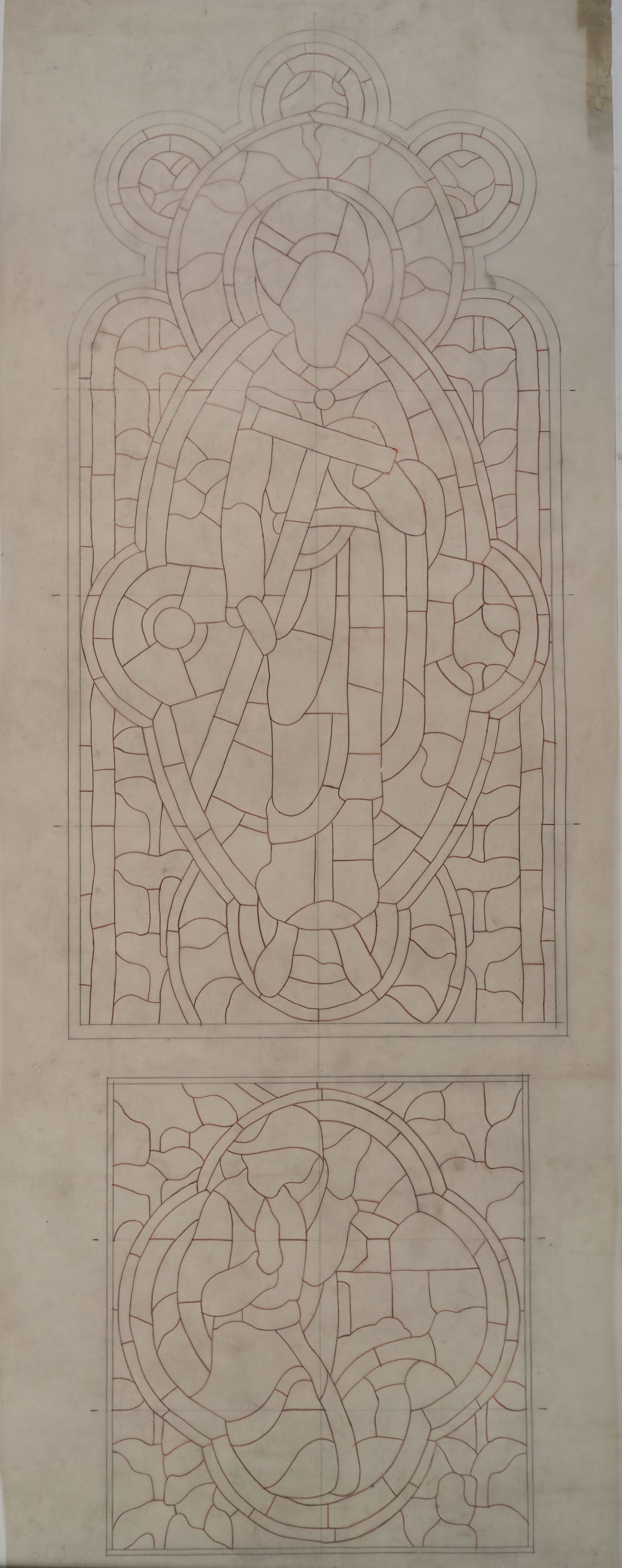 Stained glass scale cartoon, Bishop's Chapel Window at Rosary Cathedral in Toledo, OH. Depicts St. Philip with a Tau cross; the prophet Zephaniah with a temple.Type of Drawing