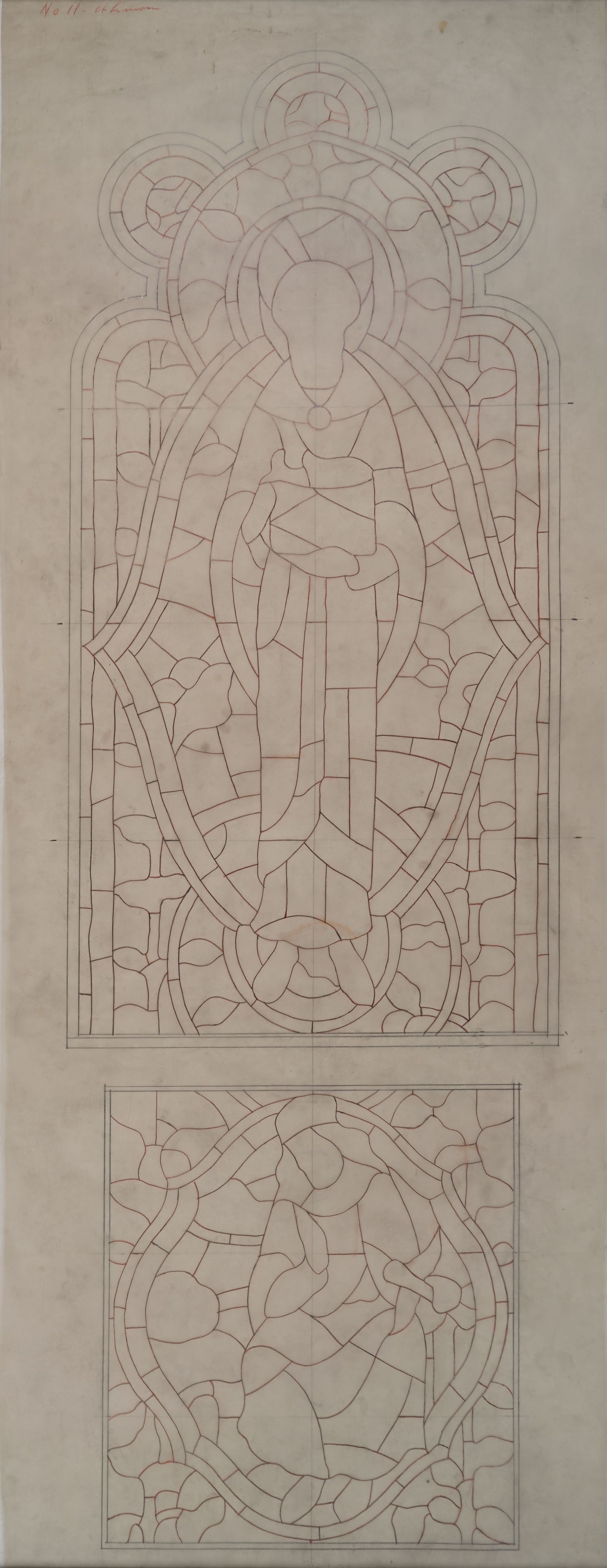 Stained glass scale cartoon, Bishop's Chapel Window at Rosary Cathedral in Toledo, OH. Depicts St. Simon the Zealot with a Bible and fish; the prophet Zechariah with a ball of eyes and a scroll with wings. OutlineType of Drawing