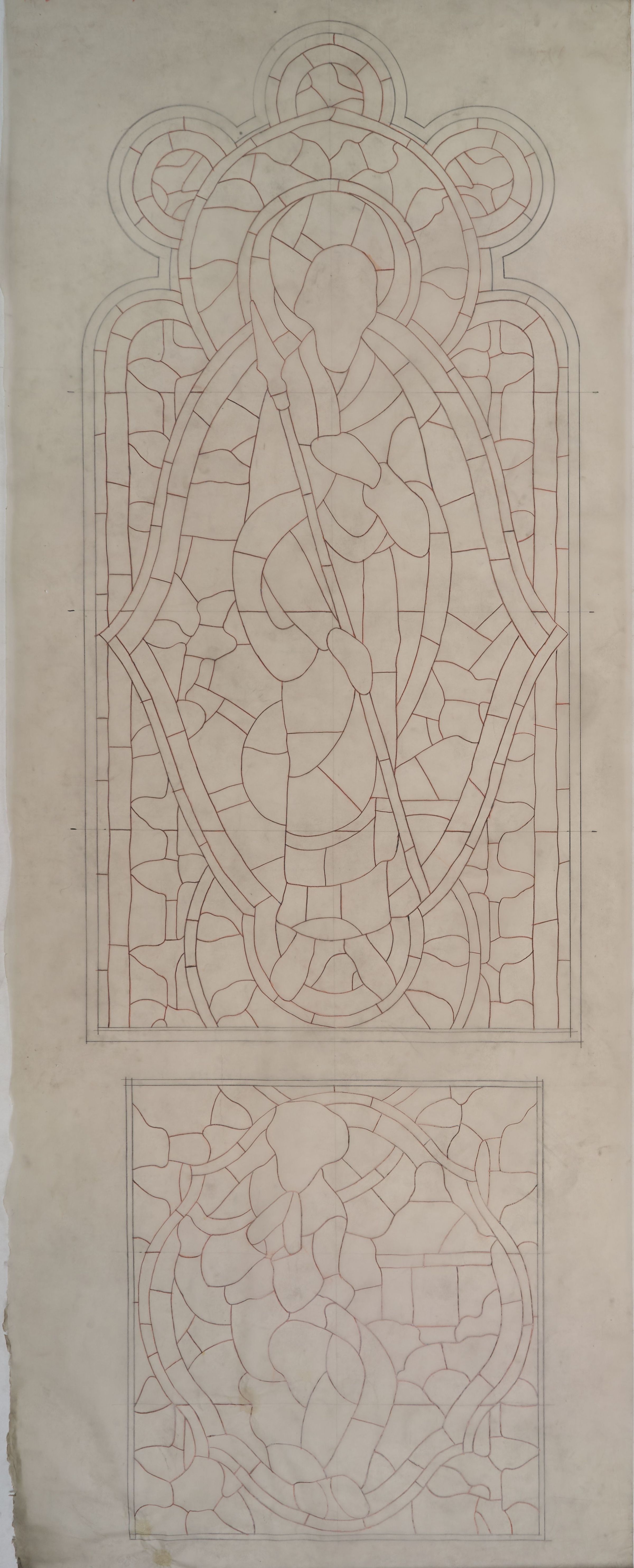 Stained glass scale cartoon, Bishop's Chapel Window at Rosary Cathedral in Toledo, OH. Depicts St. Thomas with a lance; the prophet Habakkuk near a temple. OutlineType of Drawing