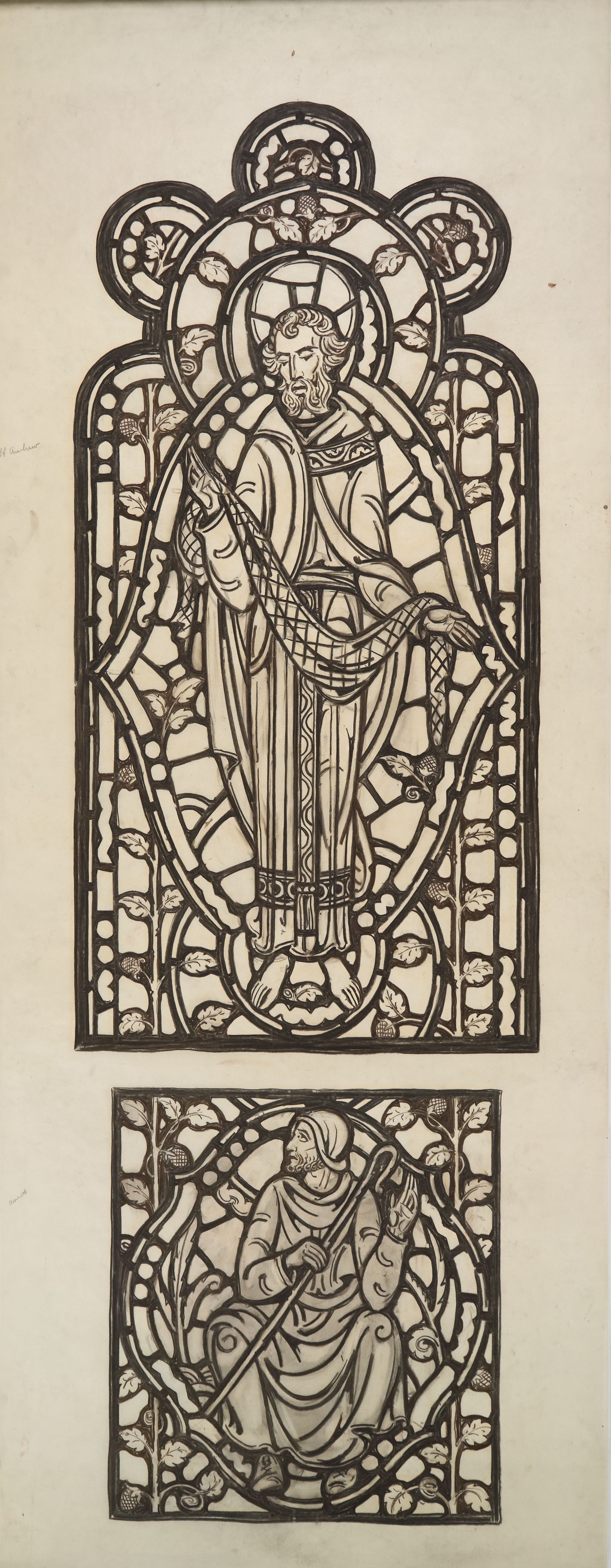 Stained glass scale cartoon, Bishop's Chapel Window at Rosary Cathedral in Toledo, OH. Depicts St. Andrew with a fishing net; the prophet Amos with a crozier.Type of Drawing