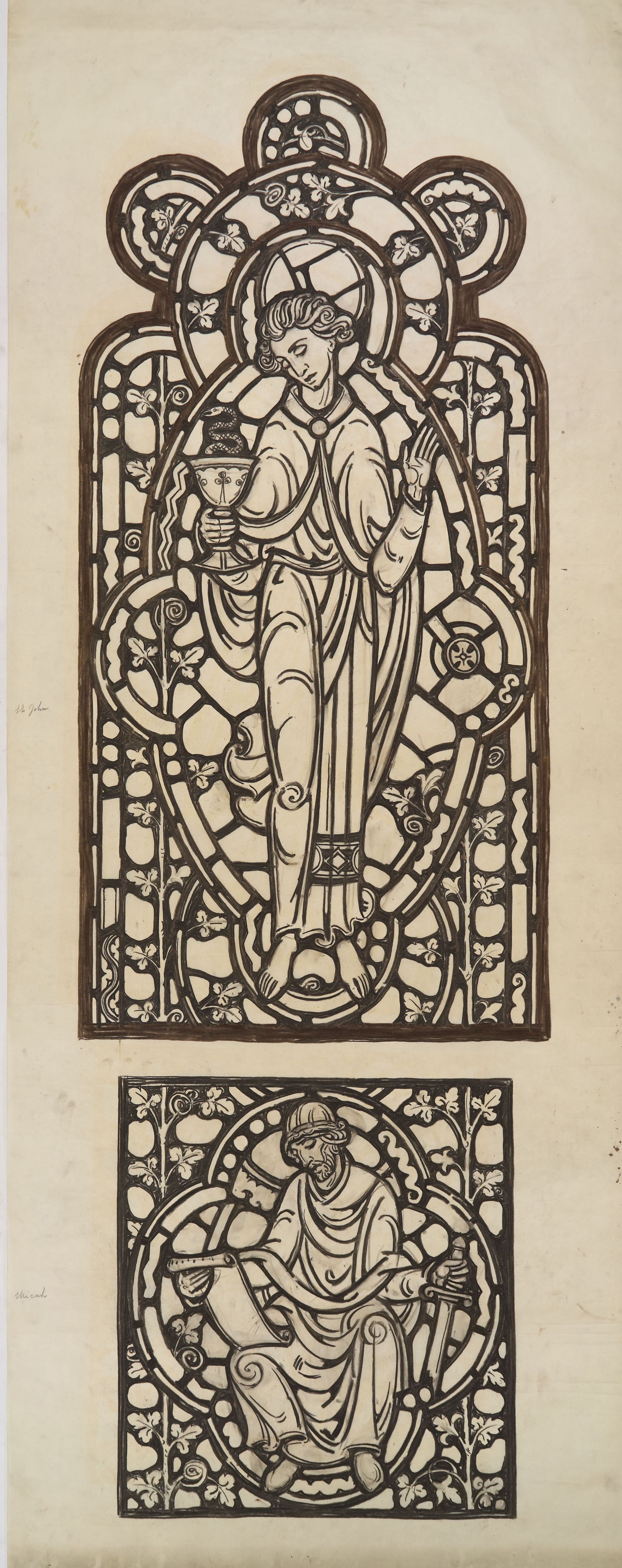 Stained glass scale cartoon, Bishop's Chapel Window at Rosary Cathedral in Toledo, OH. Depicts St. John with a chalice and serpent; the prophet Micah with a scroll and sword.Type of Drawing
