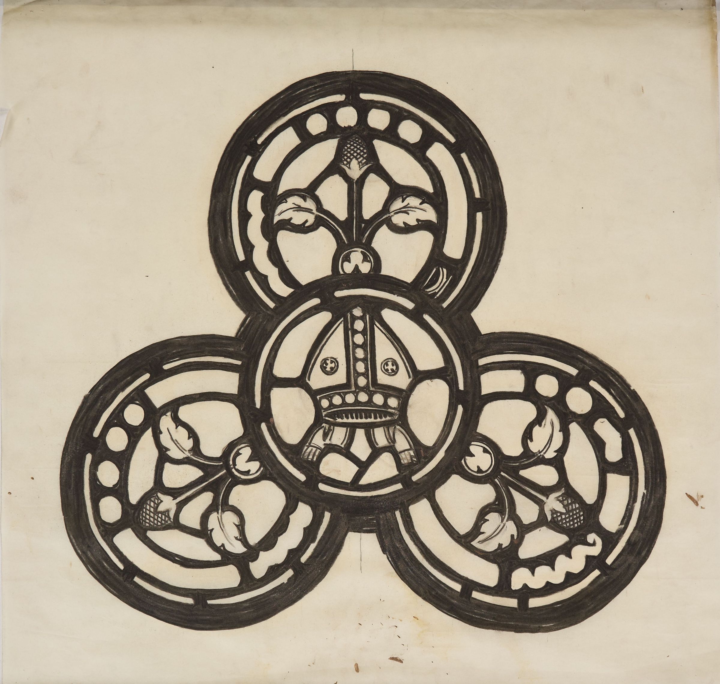 Stained glass scale cartoon, Bishop's Chapel window tracery at Rosary Cathedral, Toledo, OH. Depicts a bishop's miter.Type of Drawing