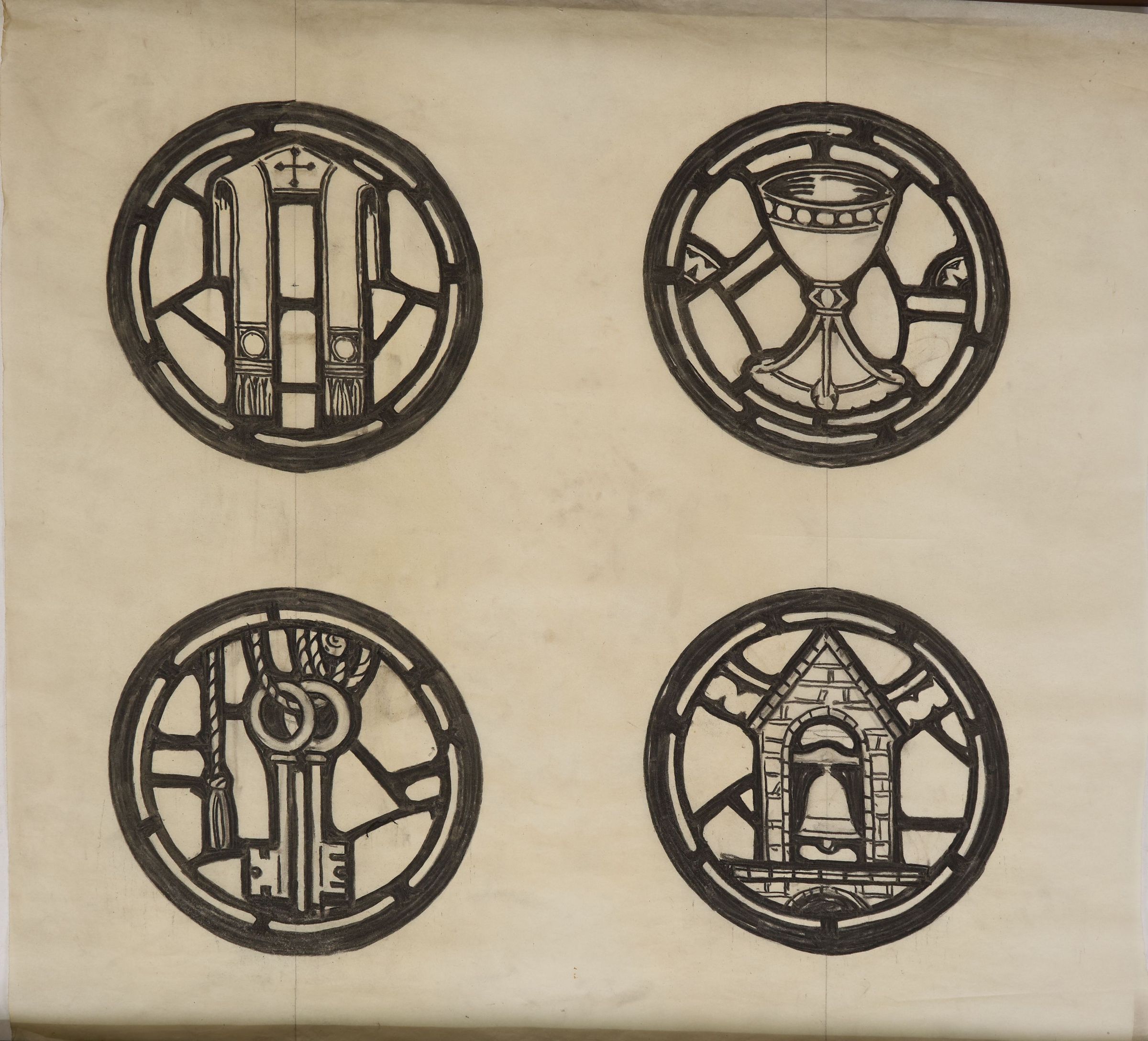 Stained glass scale cartoon, Bishop's Chapel window tracery roundels at Rosary Cathedral, Toledo, OH. Depictions clockwise from top left: stole, chalice, bell tower, keys.Type of Drawing