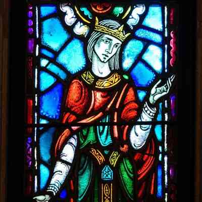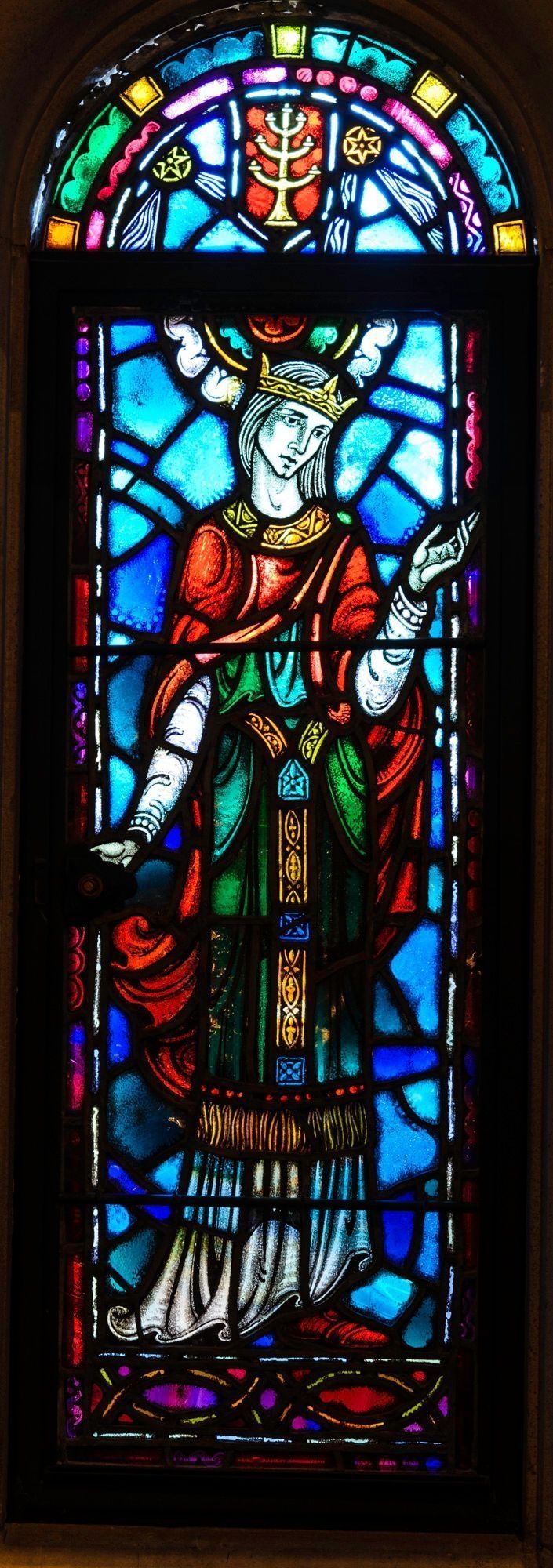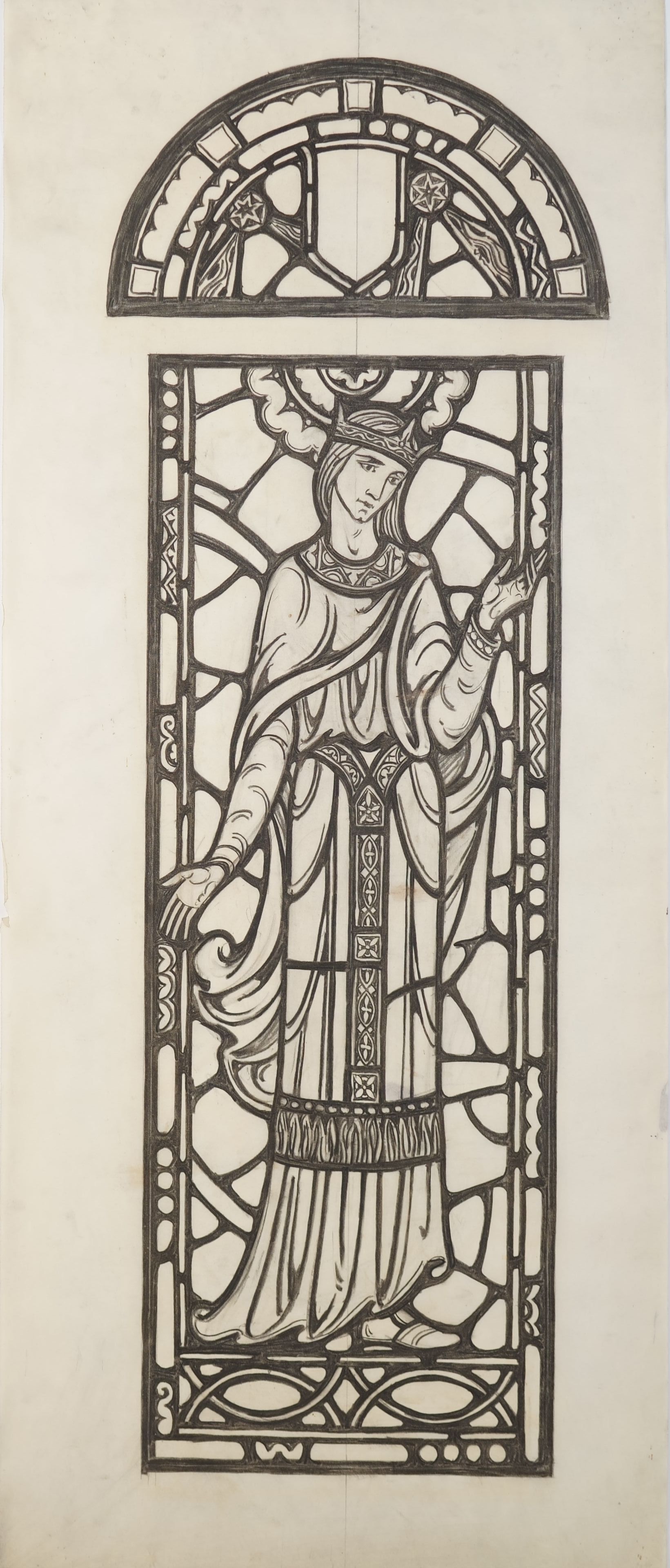Stained glass scale cartoon, Esther window in Our Lady, Queen of the Most Holy Rosary Cathedral in Toledo, Ohio. Depicts Esther wearing a crown with a candle stick above her.