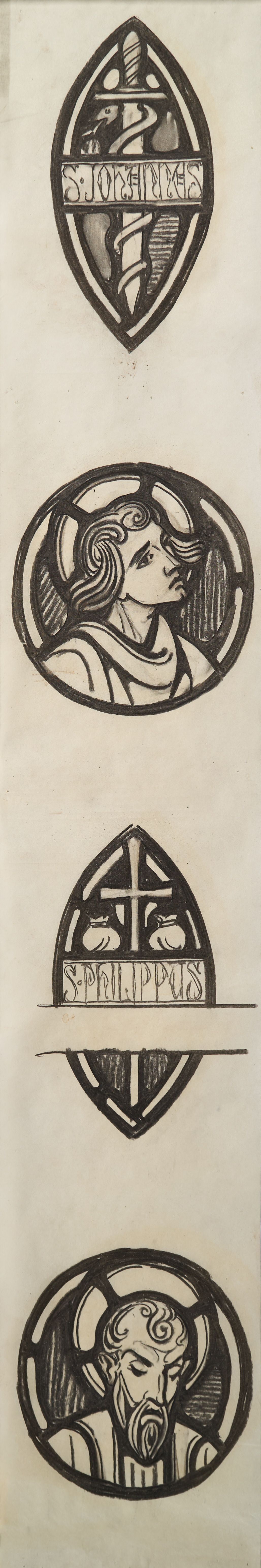 Stained glass scale cartoon, sacristry symbols at Rosary Cathedral, Toledo, OH. Four small medallions, depicting, from top to bottom: a snake and sword representing St. Johannes (John); a silhouette of St. John; a cross and two pouches representing St. Philippus (Philip); a silhouette of St. PhilipType of Drawing