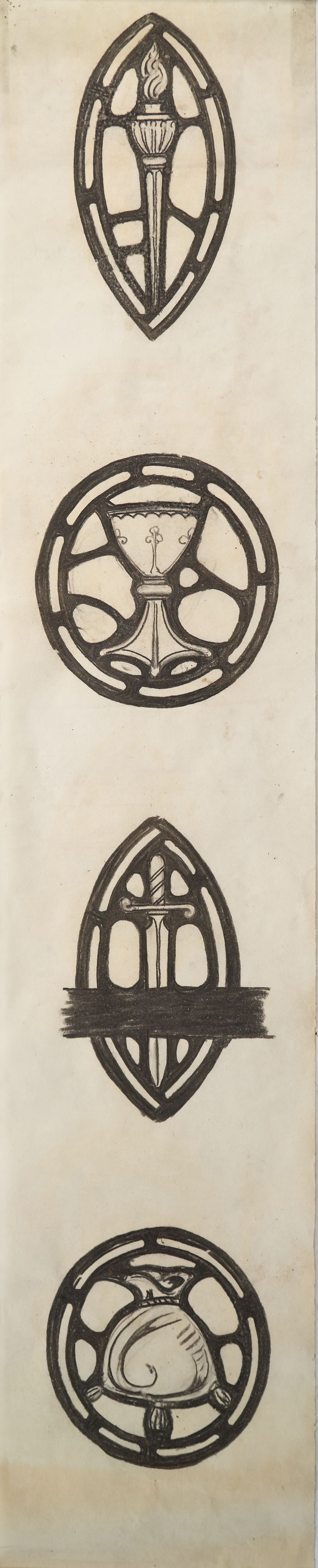 Stained glass scale cartoon, sacristy symbols at Rosary Cathedral, Toledo, OH. Four small medallions, depicting, from top to bottom: torch; chalice; sword; pouch.Type of Drawing