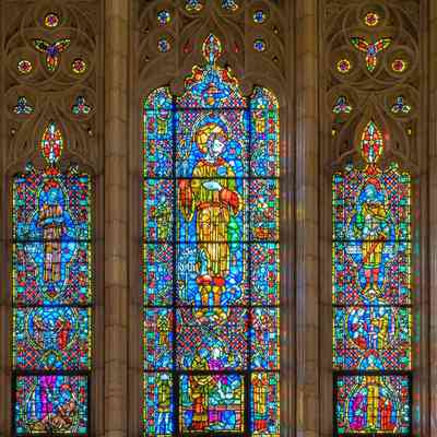 Stained glass scale cartoon, center light of Laity aisle window in Our Lady, Queen of the Most Holy Rosary Cathedral in Toledo, Ohio. Depictions from top to bottom: a hat with keys and a canteen; St. Roch with a seashell and staff; St. Roch with a sick man.