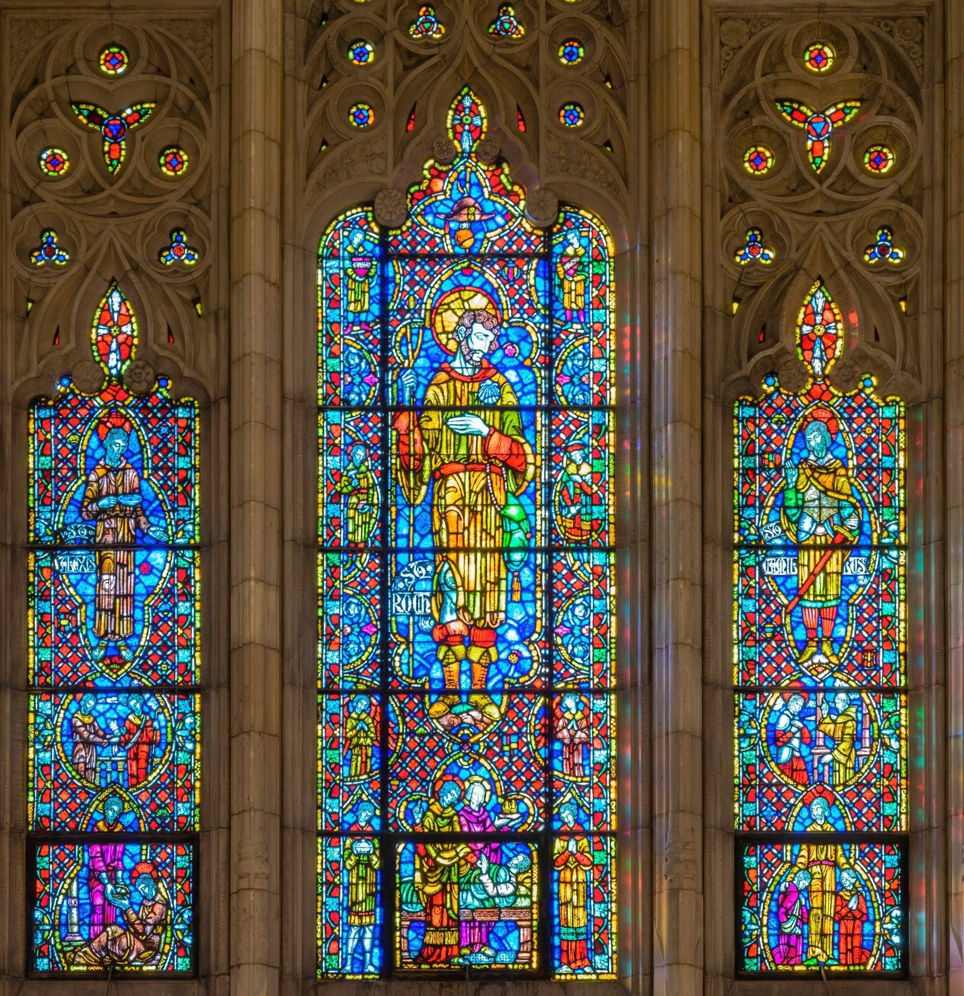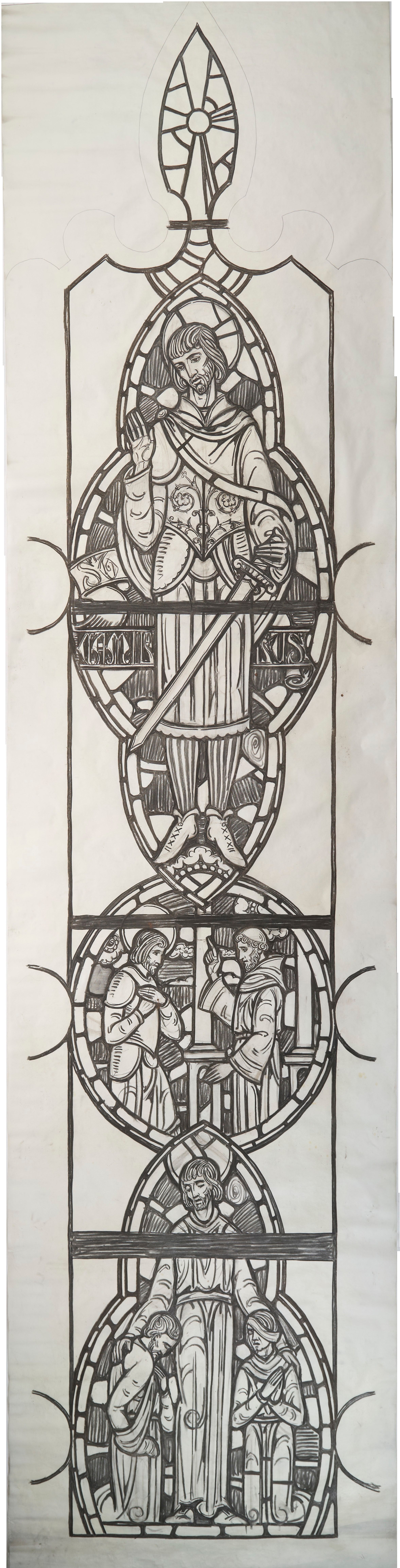 Stained glass scale cartoon, right light of Laity aisle window in Our Lady, Queen of the Most Holy Rosary Cathedral in Toledo, Ohio. Depictions from top to bottom: St. Camillus de Lellis with a sword; St Camillus with a monk; St. Camillus with two injured people in prayer.