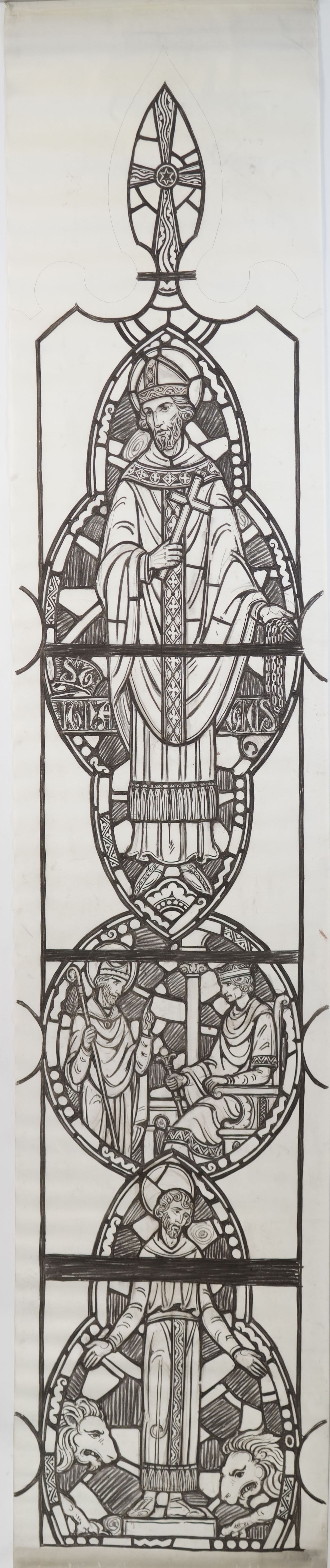 Stained glass scale cartoon, side light of Martyrs aisle window in Our Lady, Queen of the Most Holy Rosary Cathedral in Toledo, Ohio. Depictions from top to bottom: St. Ignatius of Antioch holding a cross and chains; St. Ignatius speaking to a king or emperor; St. Ignatius surrounded by lionsType of Drawing