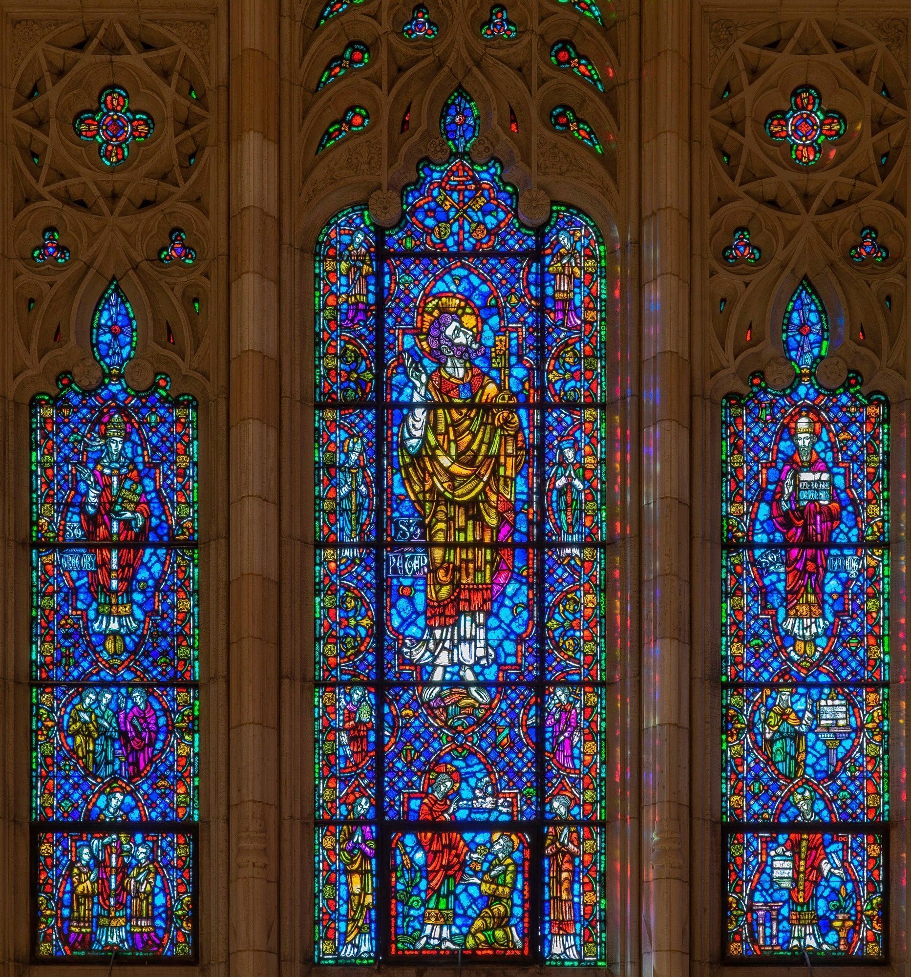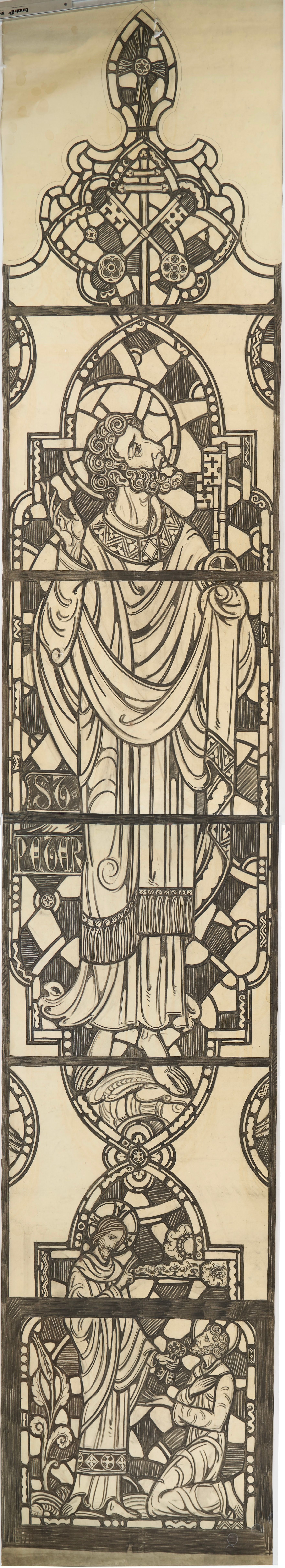 Stained glass scale cartoon, center light of Papacy aisle window in Our Lady, Queen of the Most Holy Rosary Cathedral in Toledo, Ohio. Depictions from top to bottom: the keys of St.Peter; St. Peter holding a key; Christ giving St. Peter the keys of the Church.