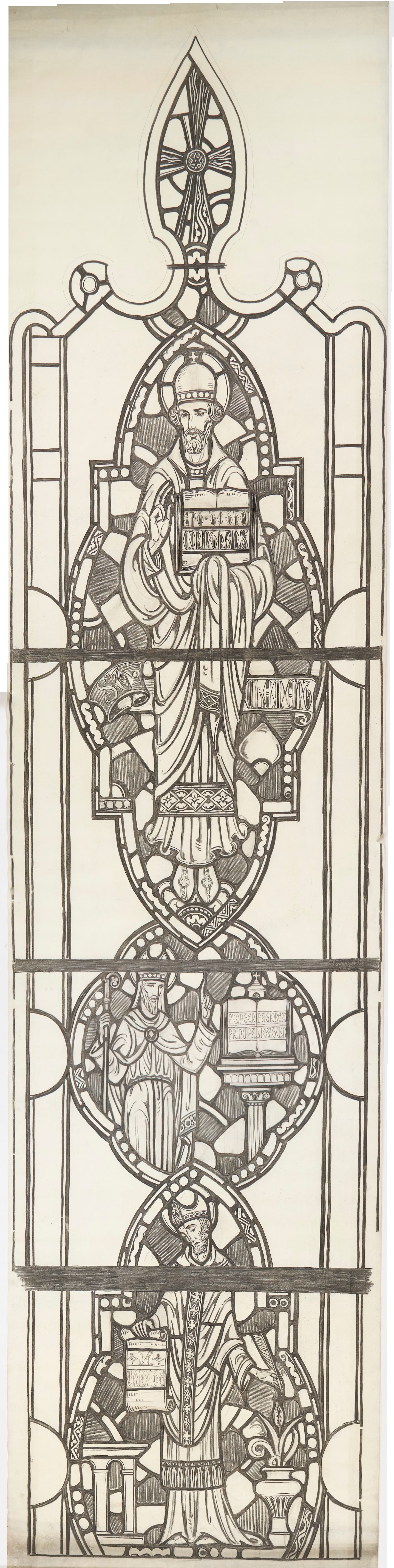 Stained glass scale cartoon, right light of Papacy aisle window in Our Lady, Queen of the Most Holy Rosary Cathedral in Toledo, Ohio. Depictions from top to bottom: St. Clement holding his First Epistle to the Corinthians; St. Clement with his writing on Apostolic Succession; St. Clement bearing a scroll and quill.