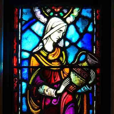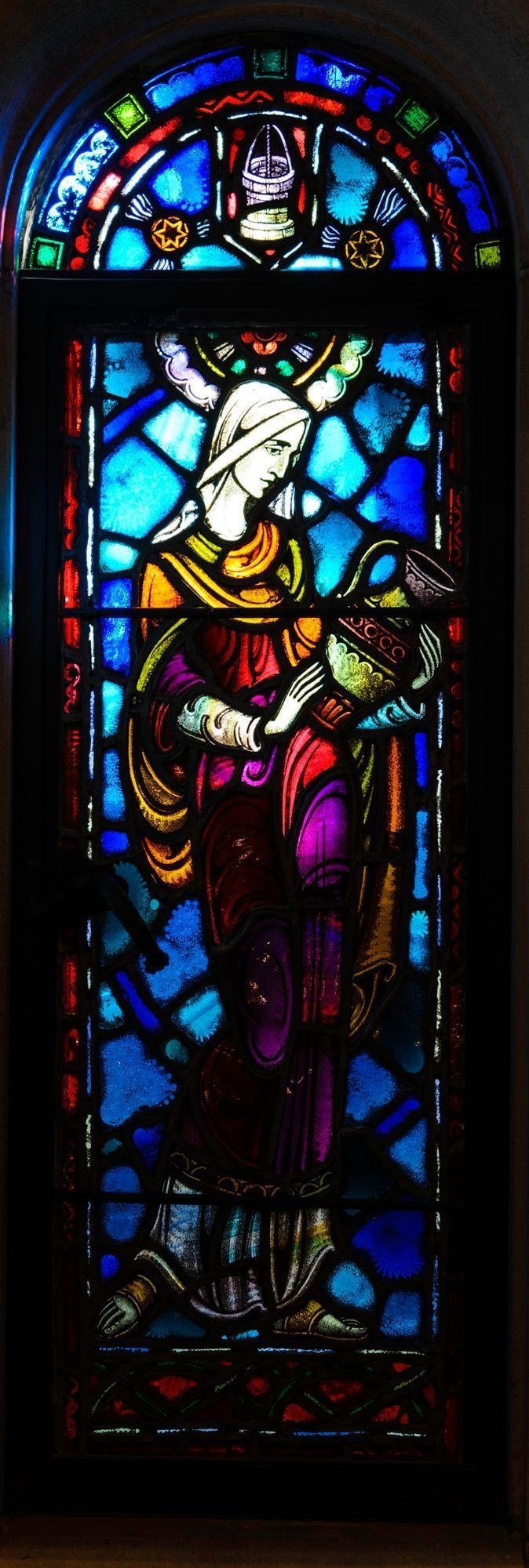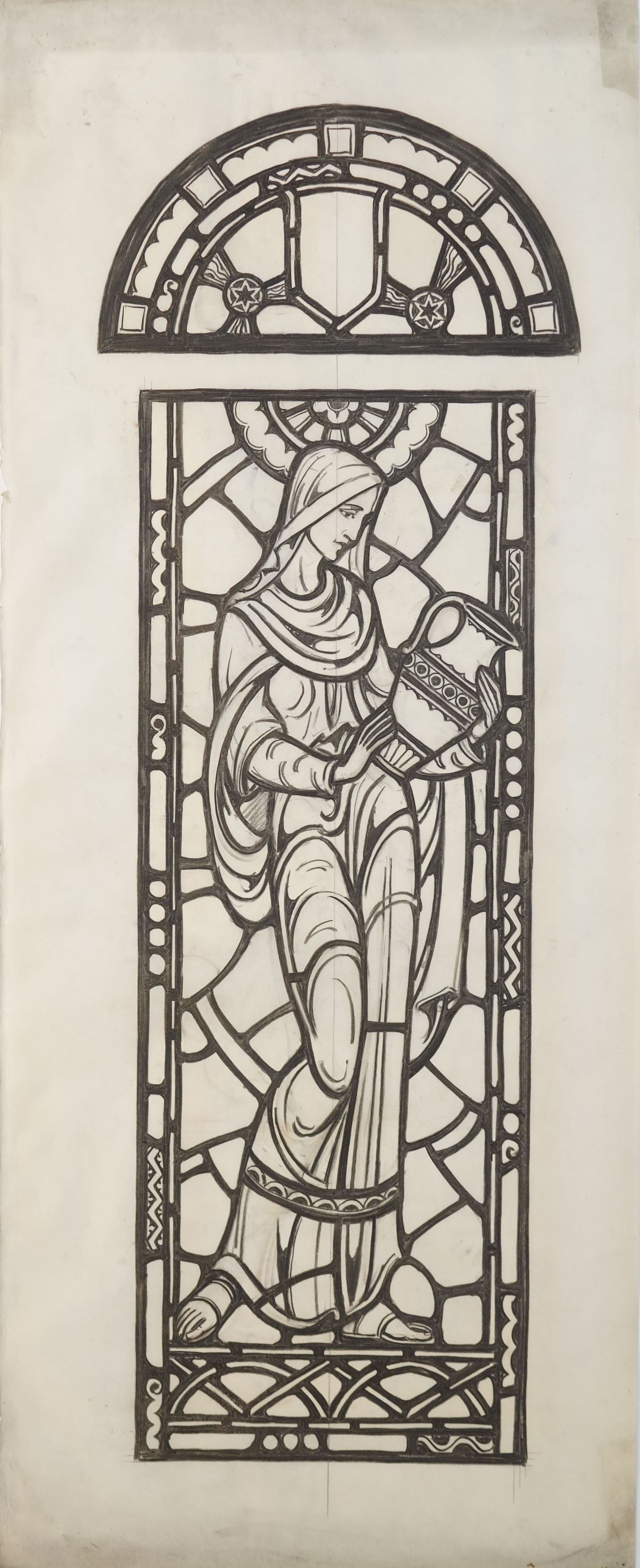 Stained glass scale cartoon, Rebecca window in Our Lady, Queen of the Most Holy Rosary Cathedral in Toledo, Ohio. Depicts Rebecca holding a vase, with a picture of a well above her (Gen 24).
