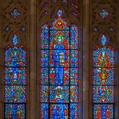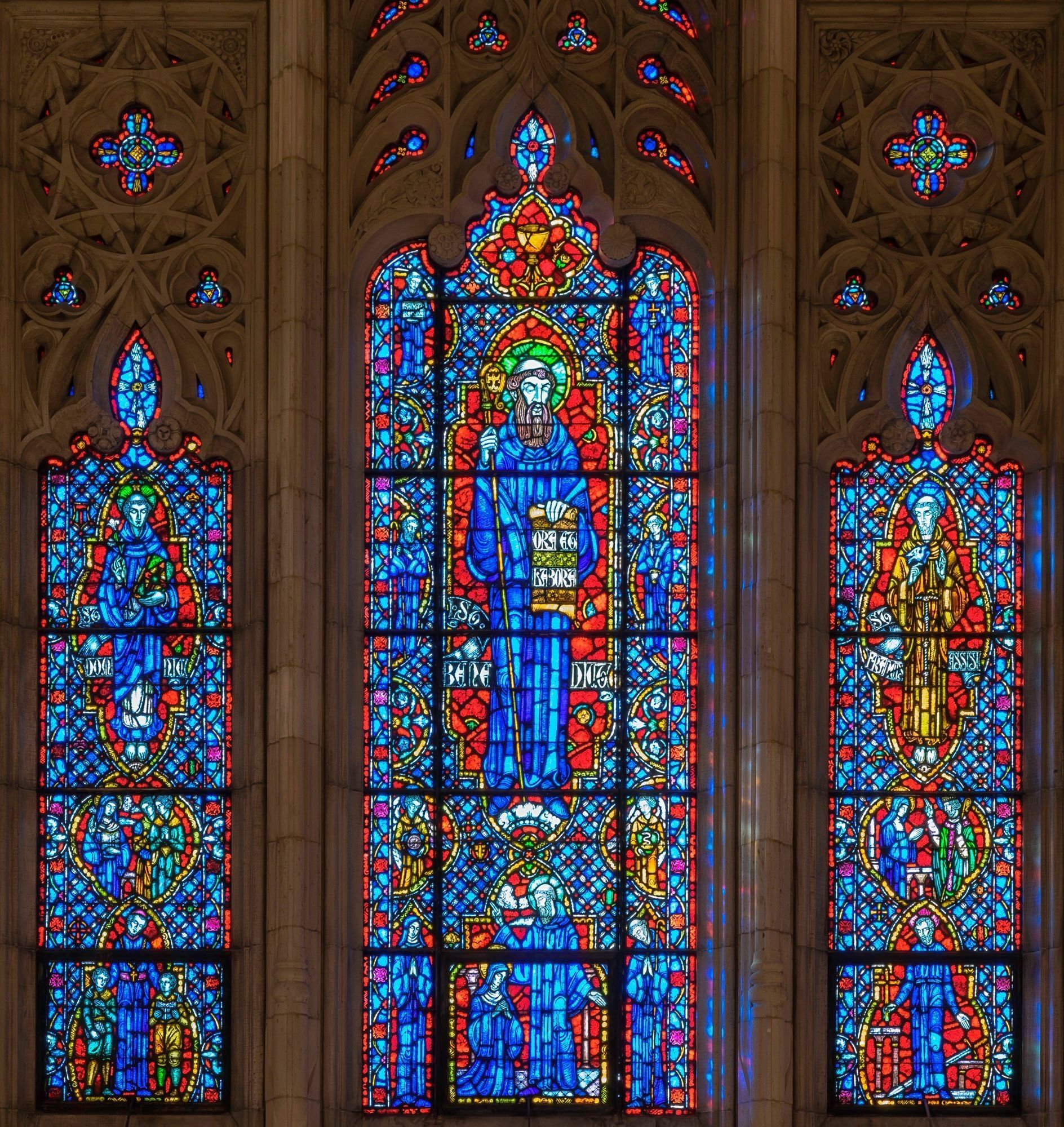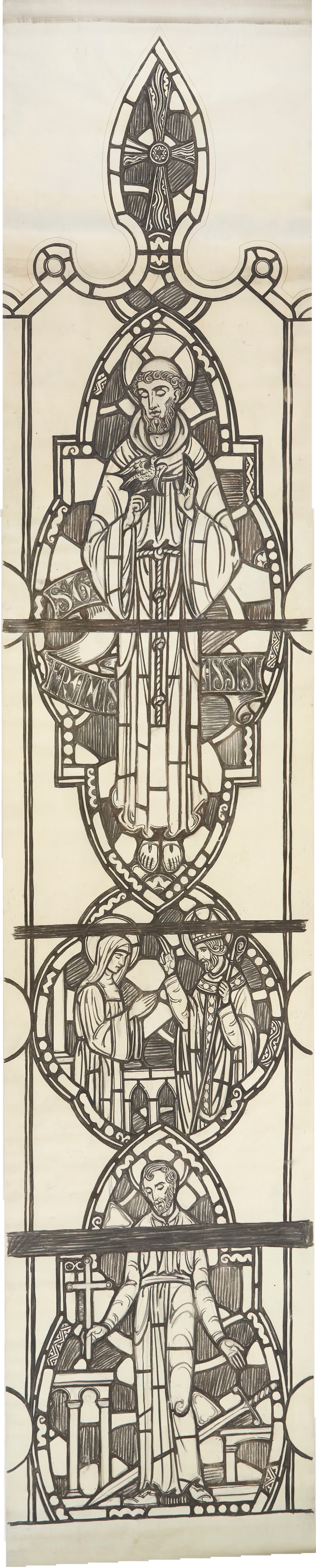 Stained glass scale cartoon, right light of Religious Orders aisle window in Our Lady, Queen of the Most Holy Rosary Cathedral in Toledo, Ohio. Depictions from top to bottom: St. Francis of Assisi with a bird; unknown female saint being blessed by unknown saintly king; unknown male saint with a cross and sword.